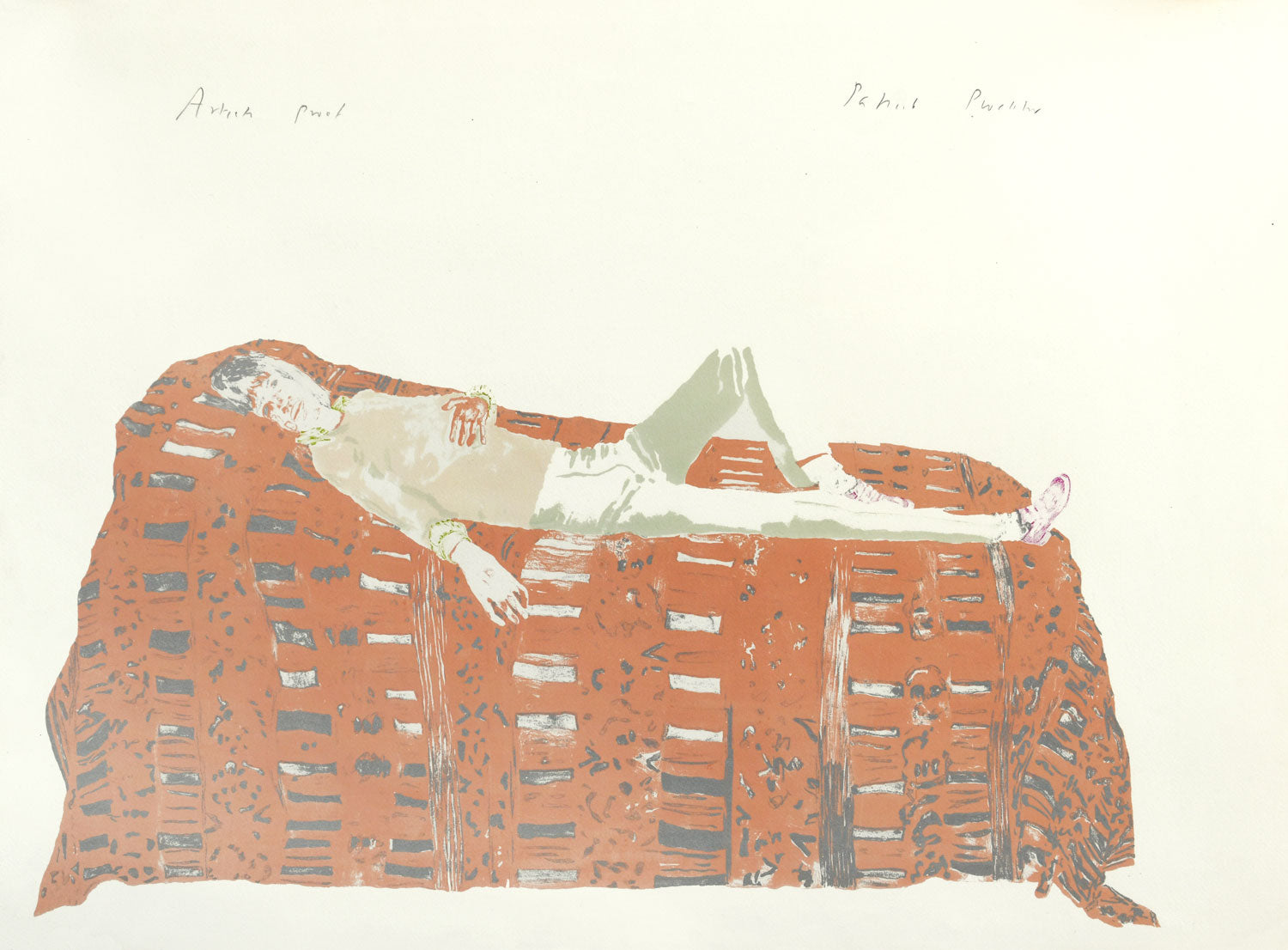 Portrait of Gervase Griffiths, friend of the artist, from a watercolour entitled 'Gervase' 1968, in the artist's collection. The figure lies on an Islamic rug owned by Procktor.