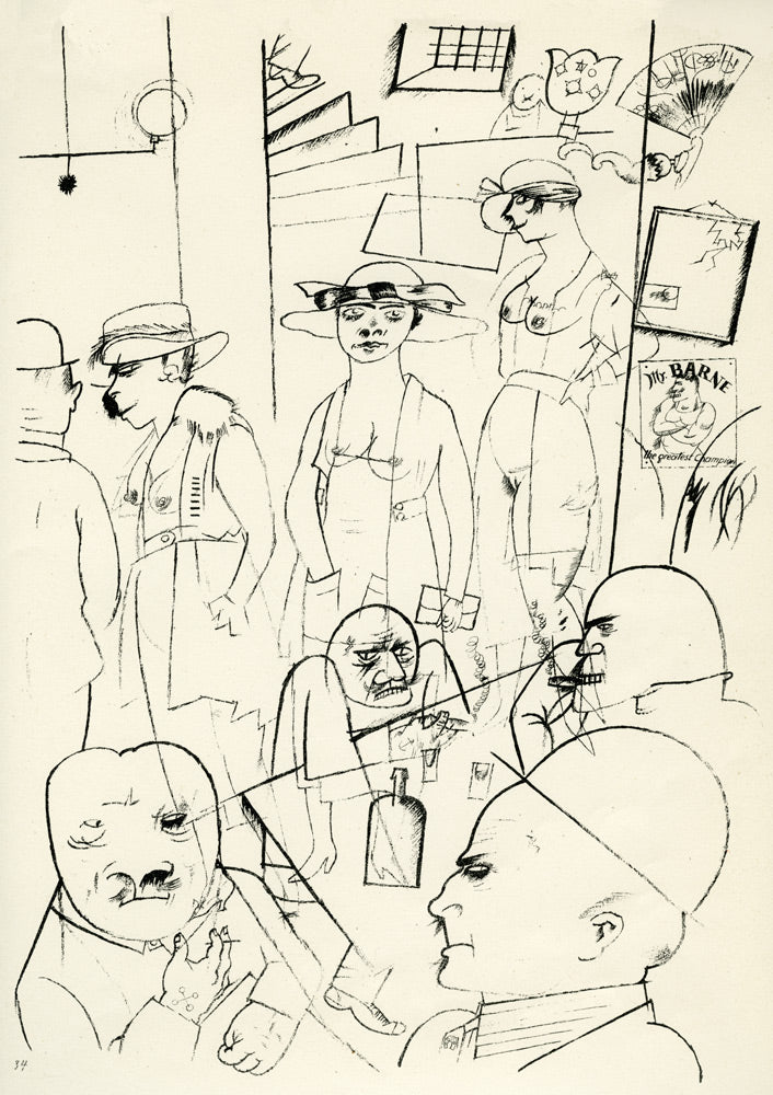 George Grosz was born in Berlin and studied there and in Dresden before moving to Paris in 1913 to develop his artistic style. Grosz fought in WW1 but after being hospitalized was discharged in 1915. Grosz was later conscripted, but in 1917 the army decided to execute him after a failed suicide attempt; their decision was fortunately overturned with the help of his patron, Count Kessler.