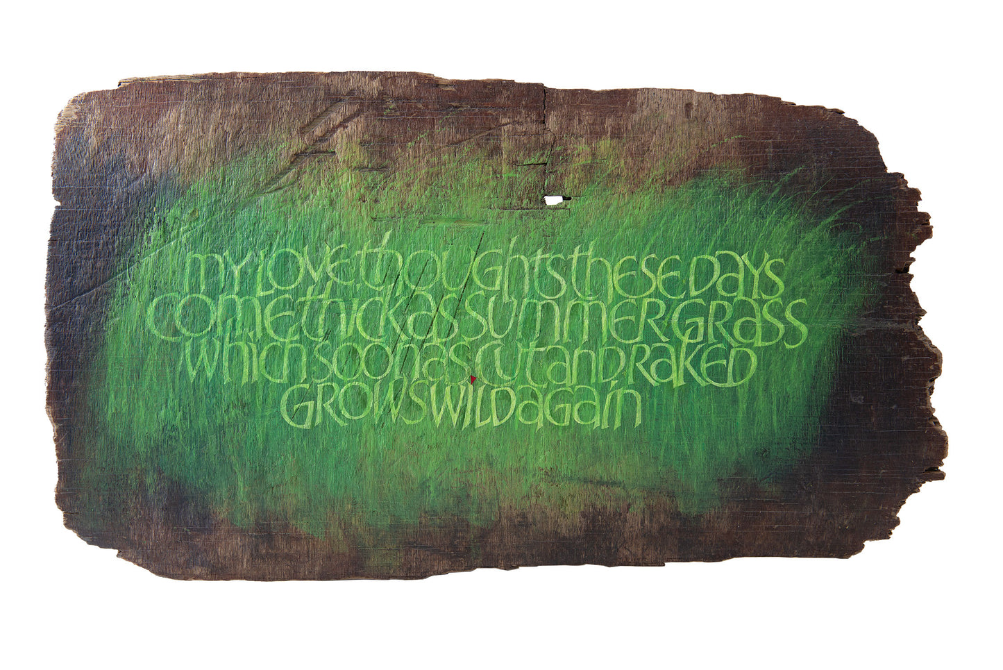 This translation of an anonymous Japanese poem celebrates the (almost anonymous) work of the English poet Ralph Hodgson, who in the 1930s assisted the committee of scholars translating and editing the Manyoshu, the earliest and greatest Japanese anthologies, originally compiled in the eighth century . Hodgson contributed by revising their initial versions and it is generally acknowledged that the quality of the published translations owes much to his ability as a scholar and poet. Summer grass is associated in Japanese poetry with making vows of love.