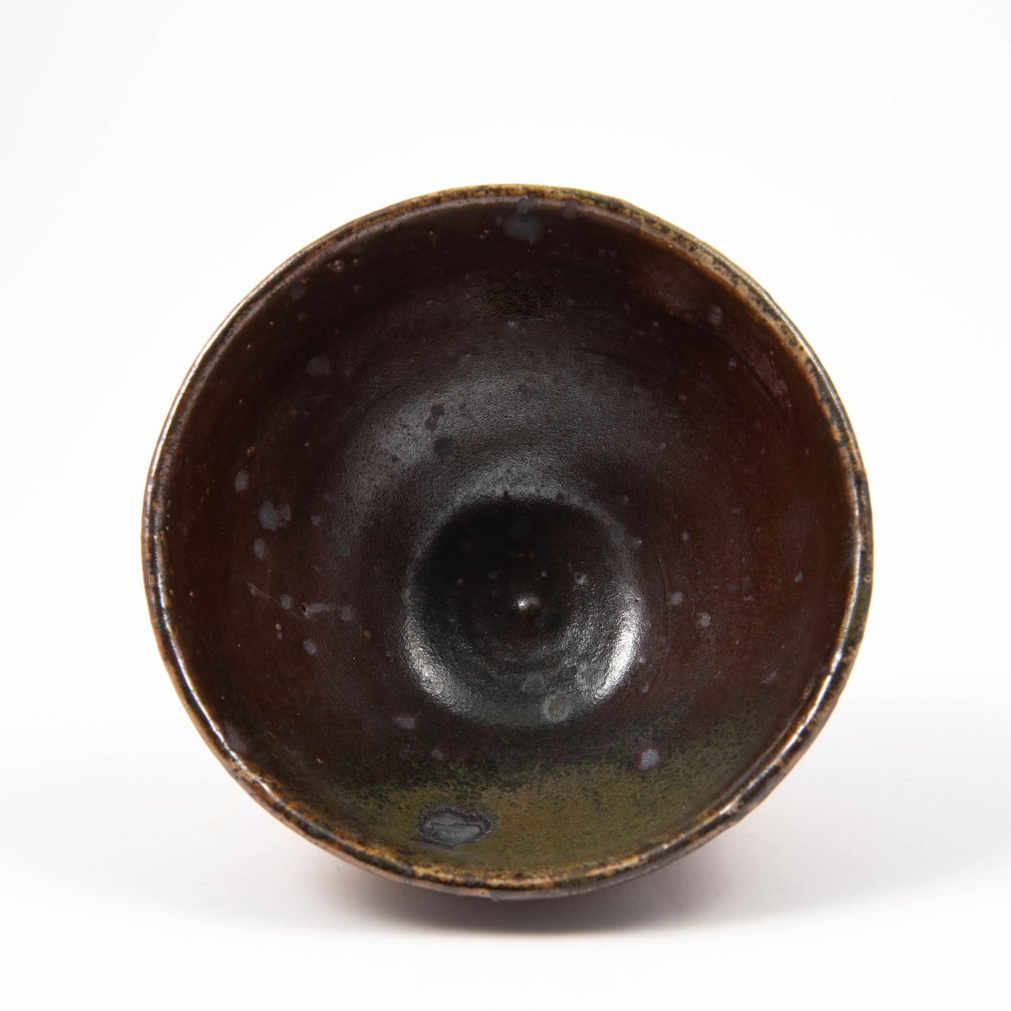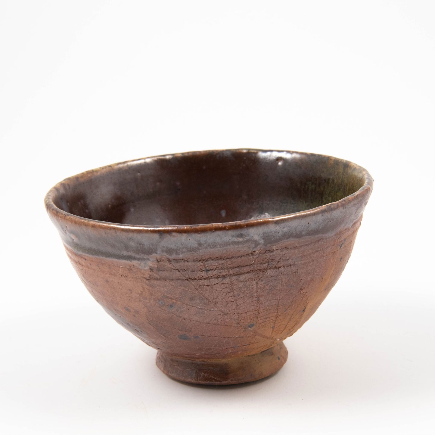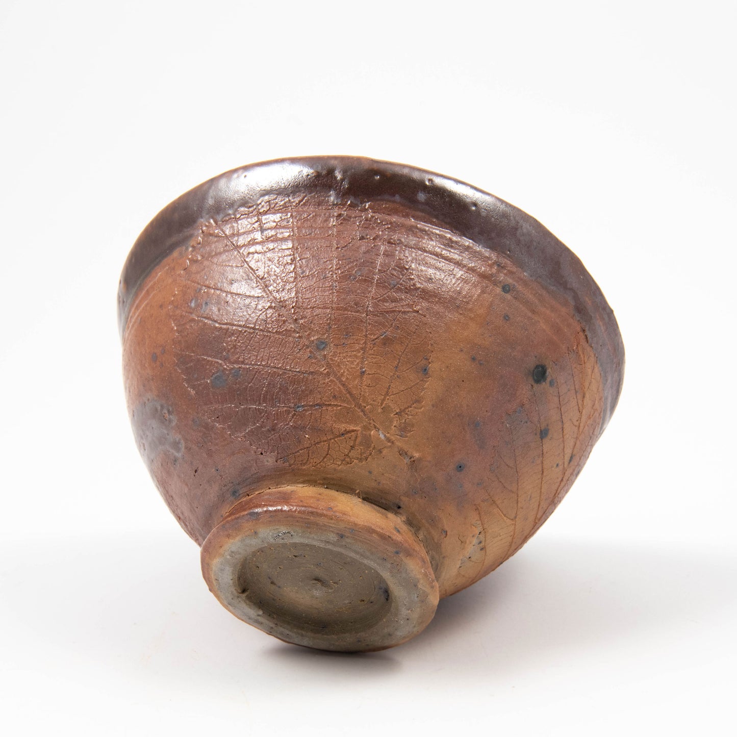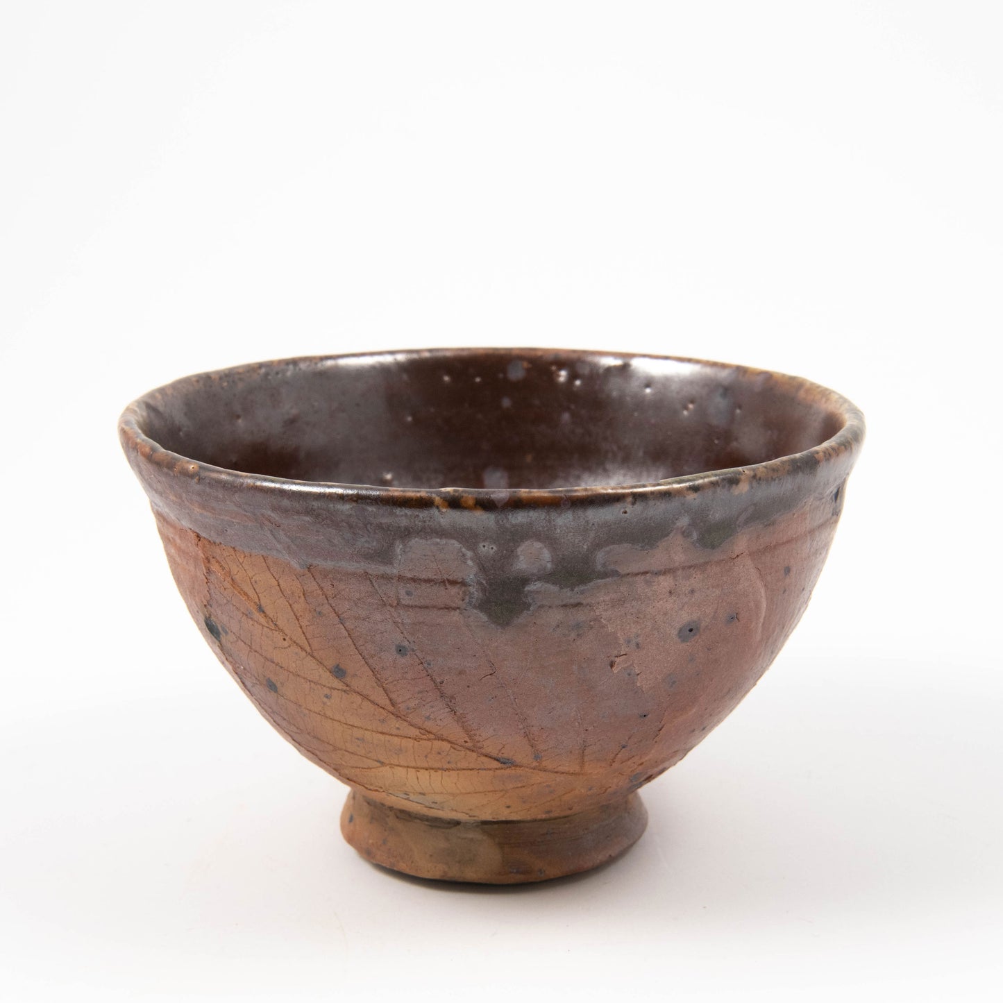 • Tenmoku with leaf impression & natural ash • Signed • 8cm x 13cm