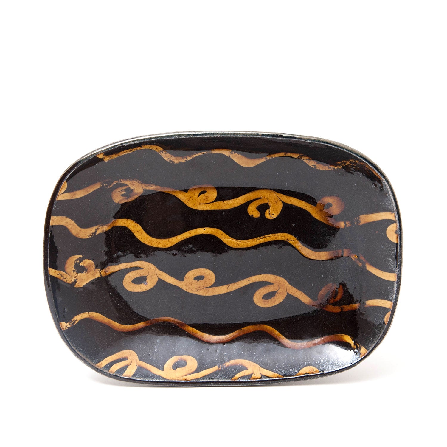 Fitch draws influence from the work of the medieval potters of England and the subsequent tradition of slip decorated country pottery, that was prevalent in this country until the early twentieth century. The slipware platters on offer here are made using the moulds originally used by the great Michael Cardew at Wenford Bridge Pottery.