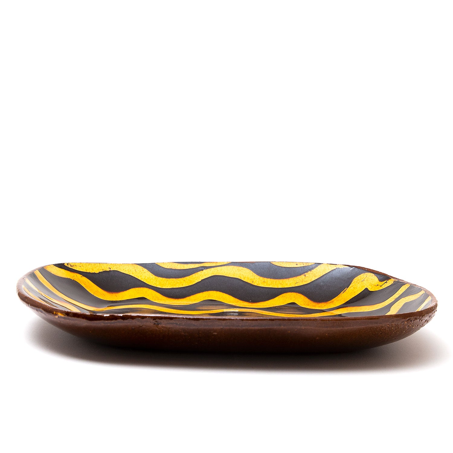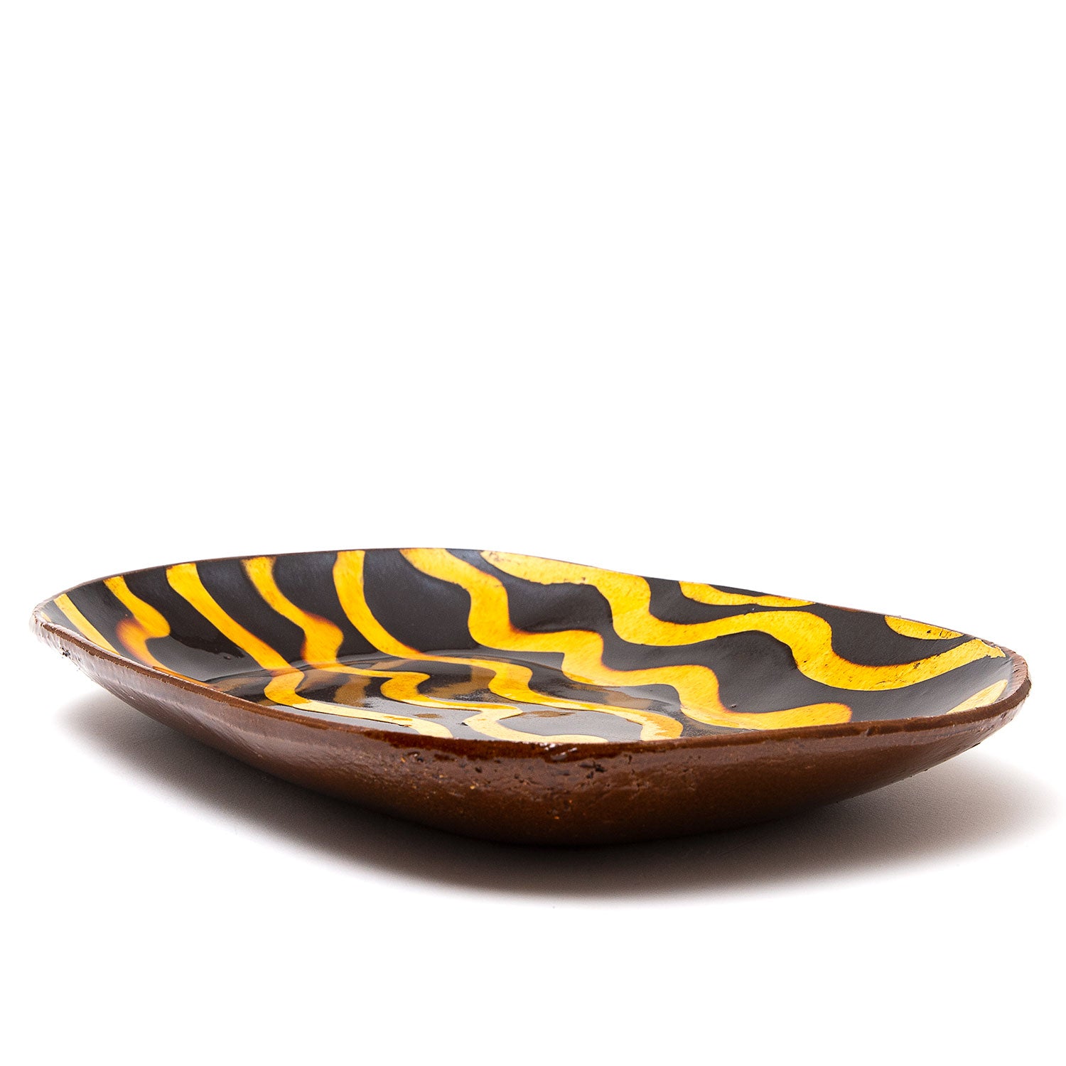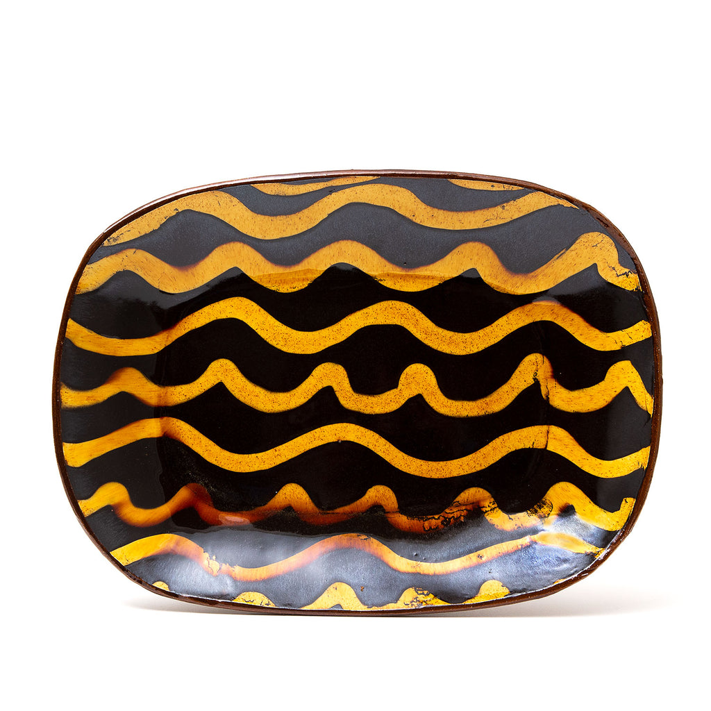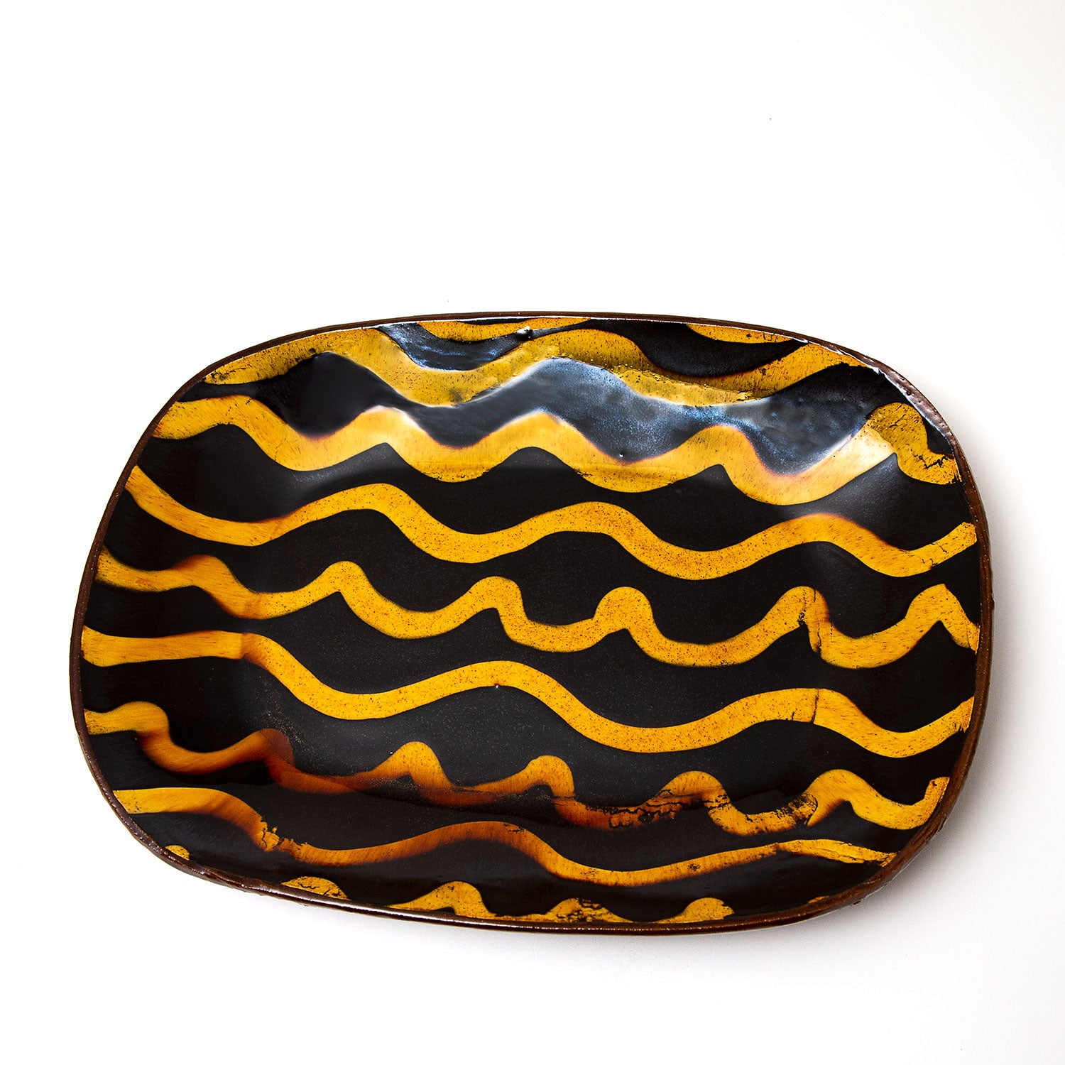 Fitch draws influence from the work of the medieval potters of England and the subsequent tradition of slip decorated country pottery, that was prevalent in this country until the early twentieth century. The slipware platters on offer here are made using the moulds originally used by the great Michael Cardew at Wenford Bridge Pottery.