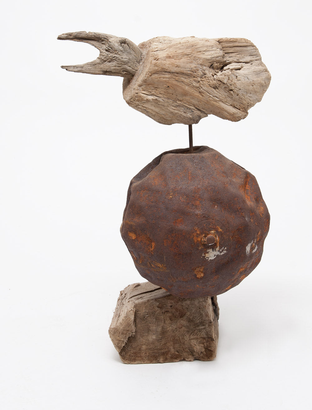He is now based in Borth near Aberystwyth in Wales, where the flotsam and jetsam from the nearby sea is his only source of materials. Working with found objects, nothing is changed - simply introduced to one another. His driftwood pieces, usually birds, boats or mythical beasts, are full of his passion, integrity and wonderful humour.