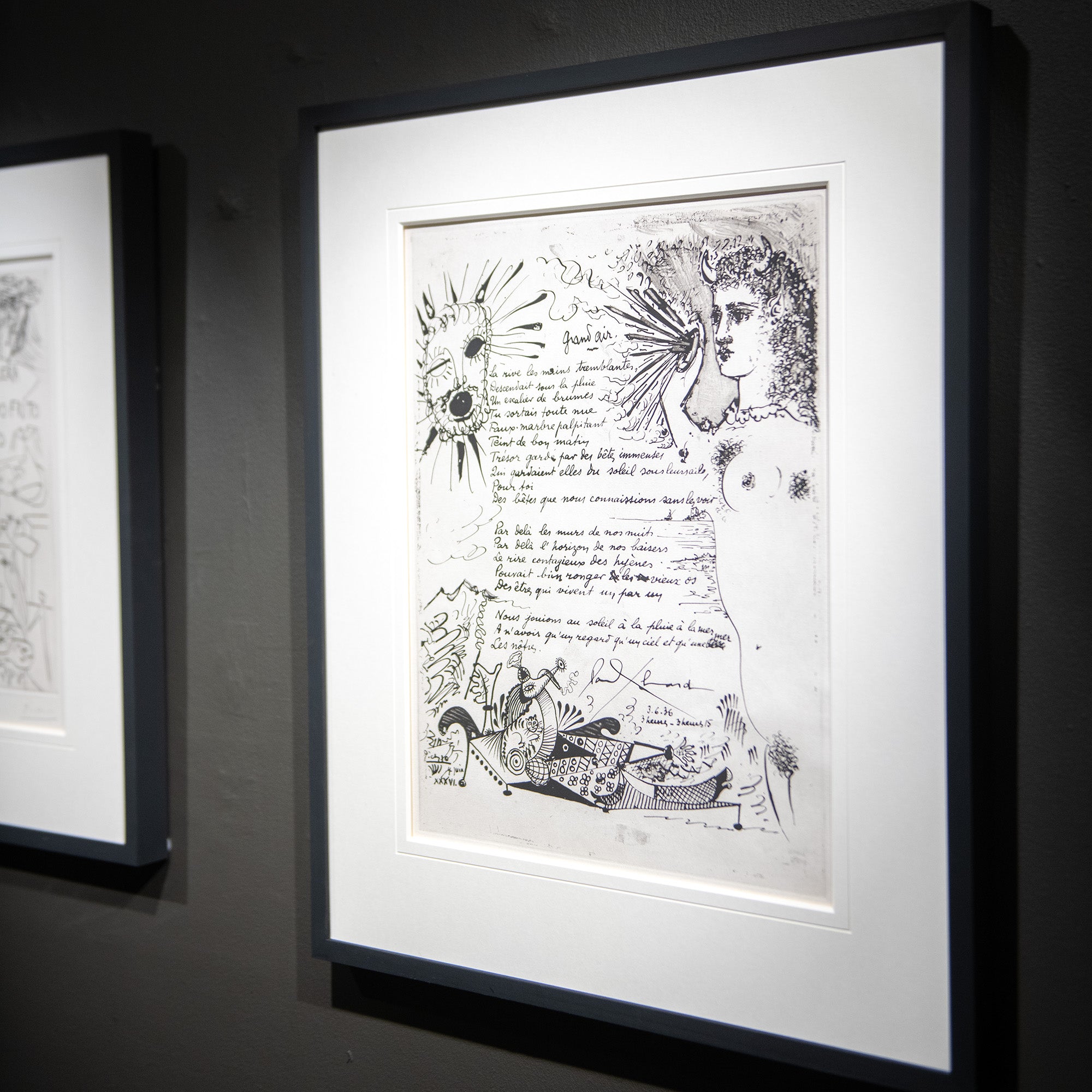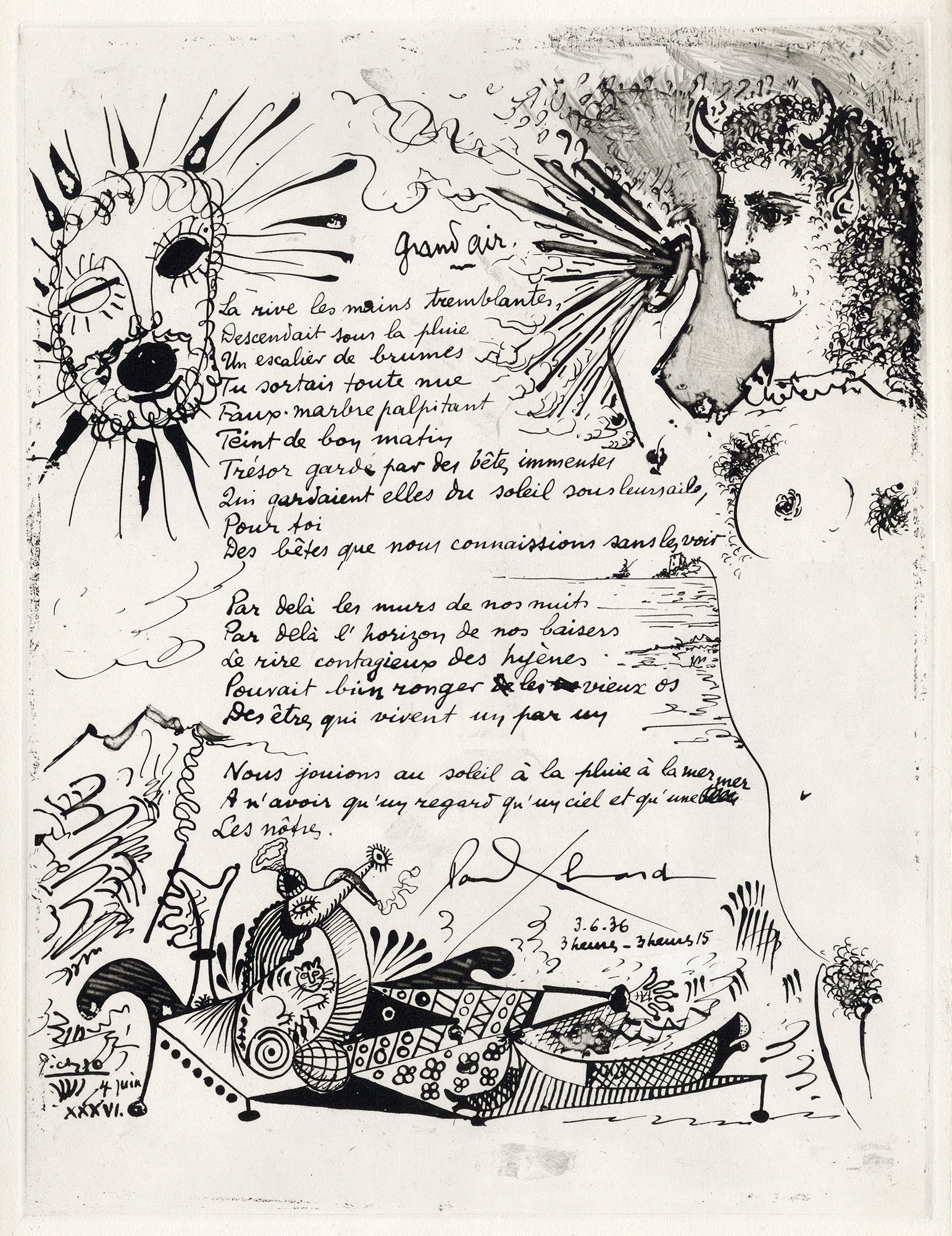 Original monochrome etching with scraper by Picasso with Eluard's engraved autograph text, signed in the plate by Eluard and Picasso, dated in the plate '3.6.36' by Eluard and '4 juin / XXXVI' by Picasso. Printed by Roger Lacourière, Paris on laid vergé de Montval paper with the Montgolfier watermark. A very scarce proof example of 'Grand Air', the remarkable collaborative Surrealist etching by Eluard and Picasso, aside from the edition of ten copies issued with the book 'Les Yeux Fertiles' and inscribed 'épreuve d'artiste'.