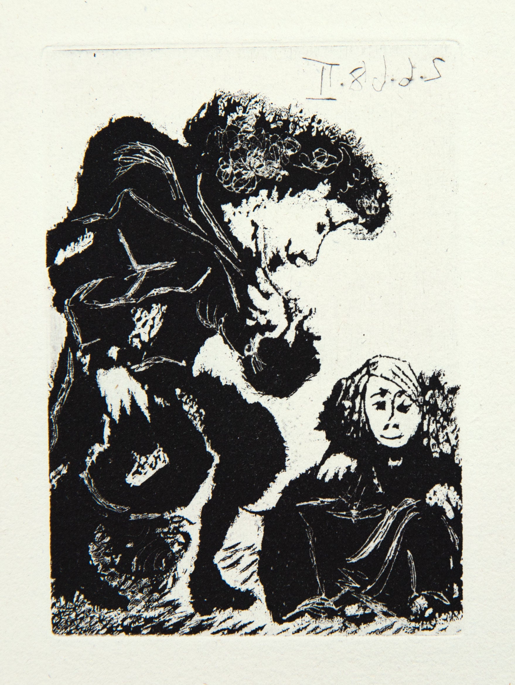 Between March 16 and October 5, 1968, Picasso worked on the plates almost daily, using various techniques (sometimes on the same plate); he was impatient to see the impression as soon as it was pulled by Aldo and Piero Crommelynck, who had installed their atelier at Mougins.