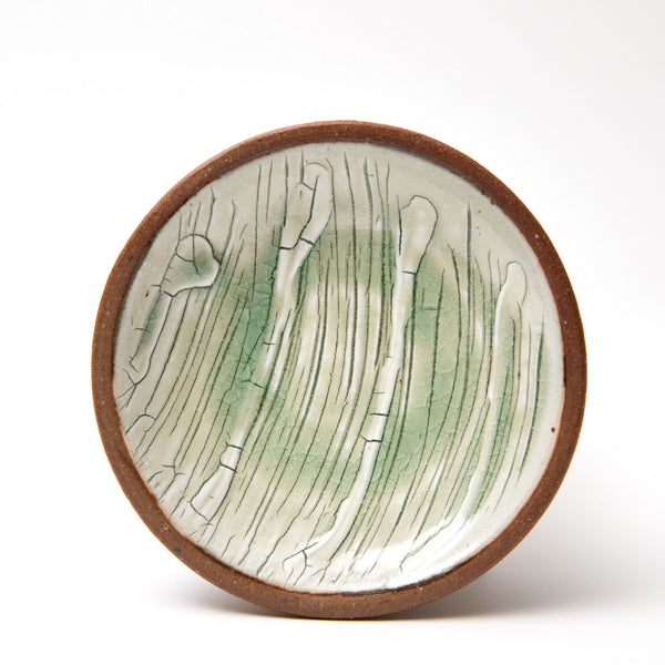 Peat clay and ash glaze with crackle slip.