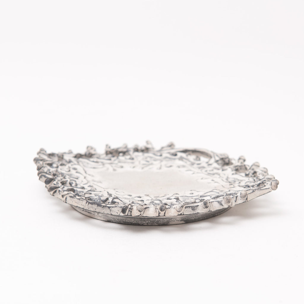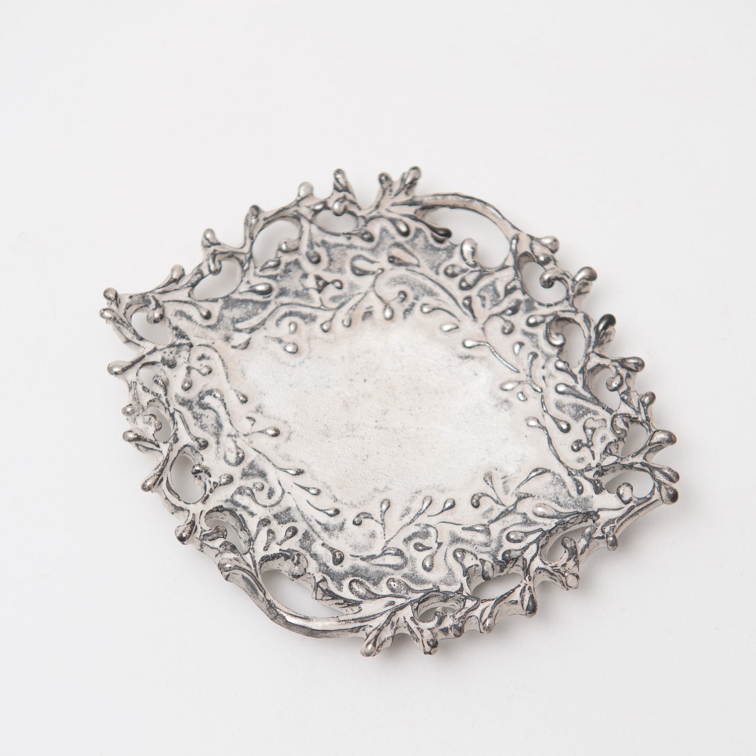 With smoky, metallic glazes he captures the ornate opulence of Persian and Moorish silverware, tempering their extravagance with a minimalism of black and white surfaces.