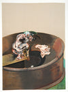 Francis Bacon (28 October 1909 – 28 April 1992) was an Irish-born British figurative painter known for his bold, grotesque, emotionally charged and raw imagery. His painterly abstracted figures are typically isolated in glass or steel geometrical cages, set against flat, nondescript backgrounds. Bacon took up painting in his early 20s but worked sporadically and uncertainly until his mid-30s.