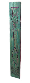 Monogrammed letter carving on spruce driftwood (board from a pallet) from the Conwy estuary with acrylic paint.