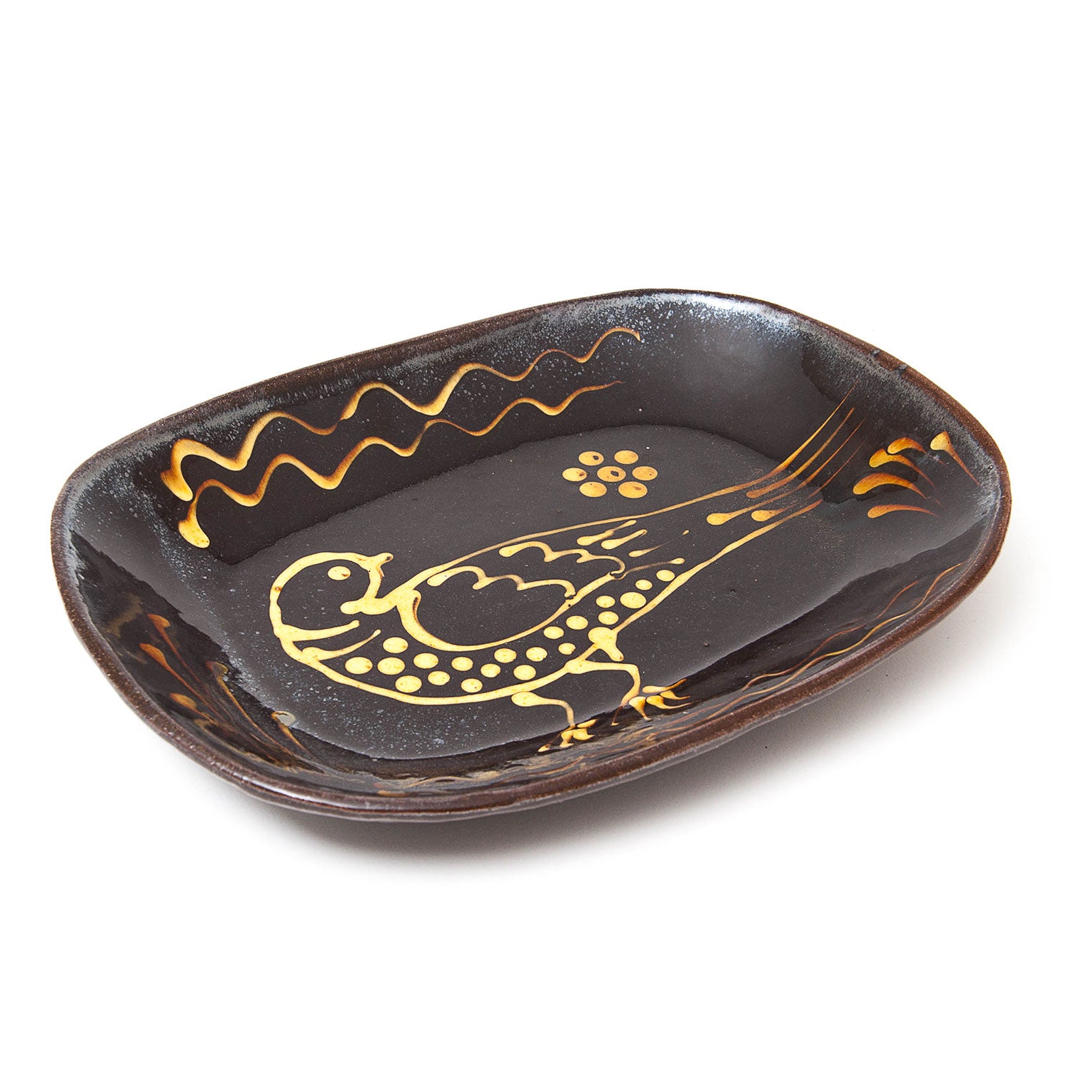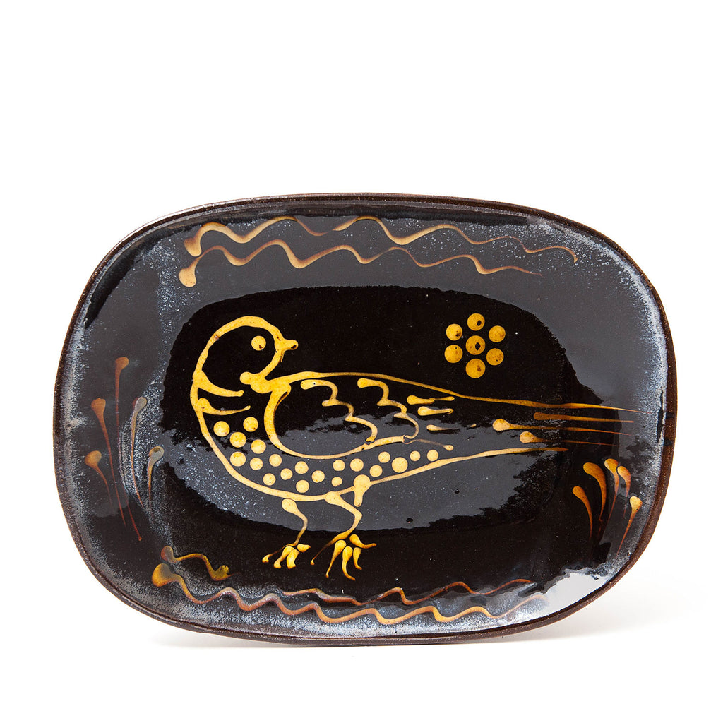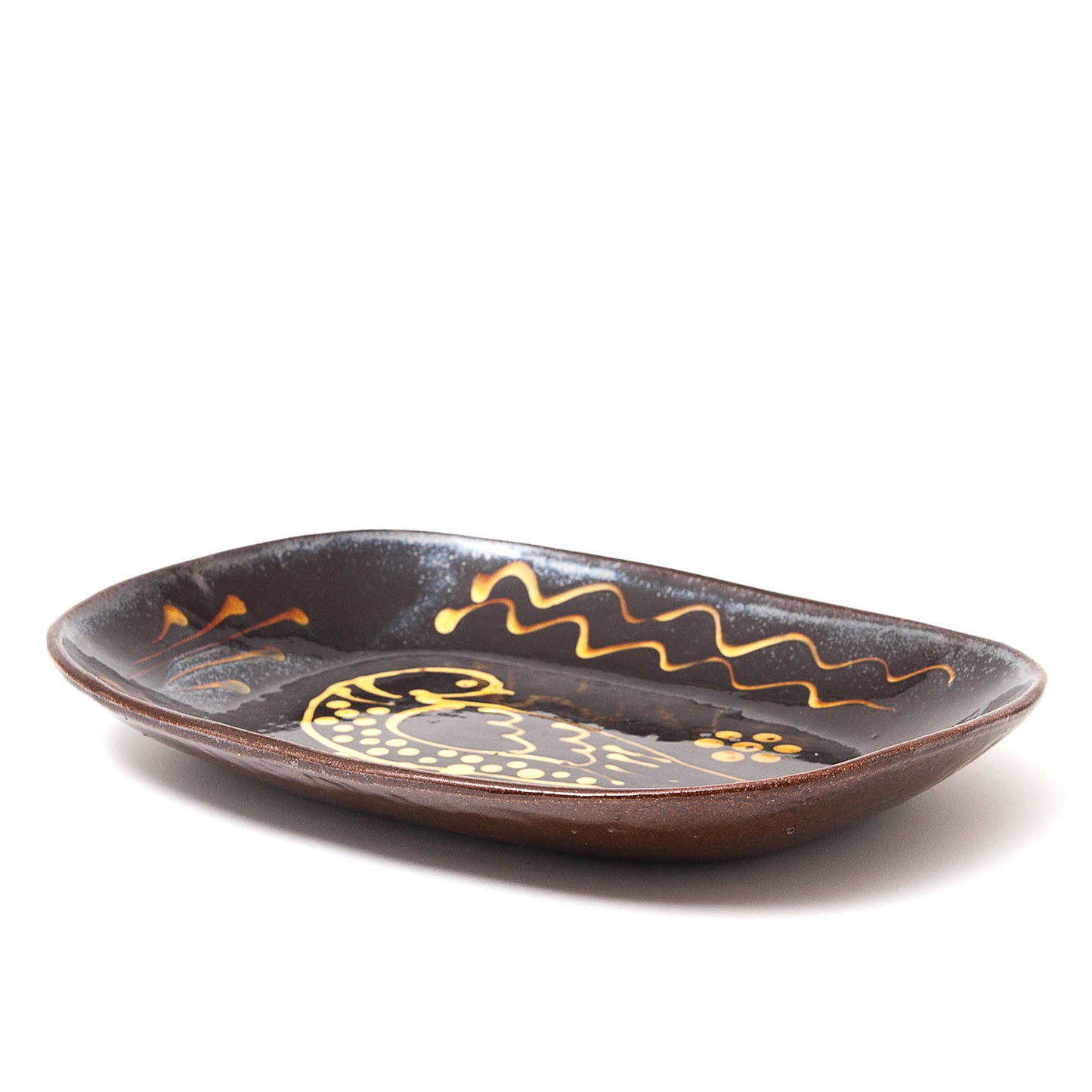 Fitch draws influence from the work of the medieval potters of England and the subsequent tradition of slip decorated country pottery, that was prevalent in this country until the early twentieth century. The slipware platters on offer here are made using the moulds originally used by the great Michael Cardew at Wenford Bridge Pottery.