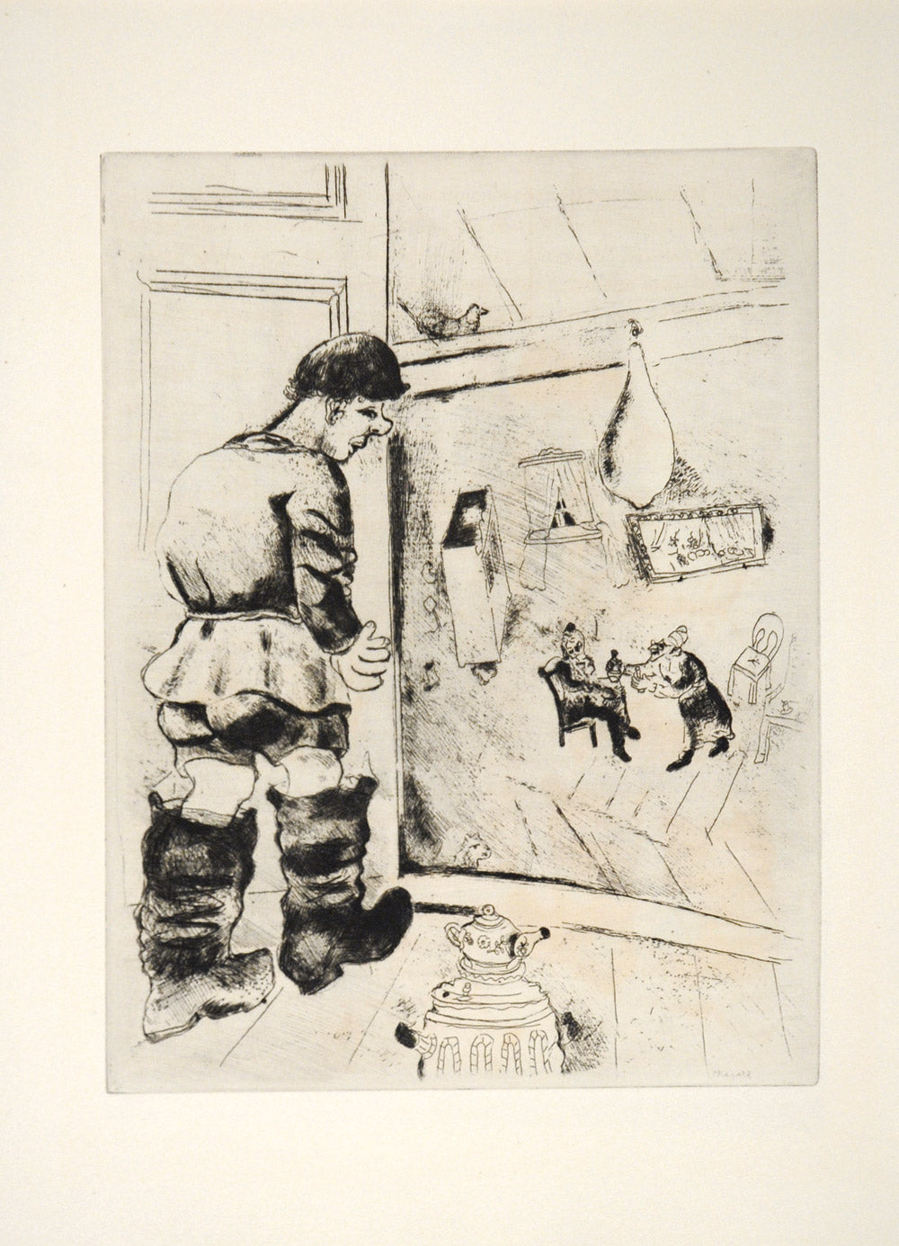 Returning to Paris in 1923 he met the art-dealer Vollard for whom he illustrated Gogol’s Dead Souls and the Fables of La Fontaine. Between 1941-47 he moved between occupied France and the USA, eventually settling near Nice. Chagall was a prolific artist, his work reminiscent of Jewish life, bible stories and of the folklore from his early years in Russia. He died in 1985.