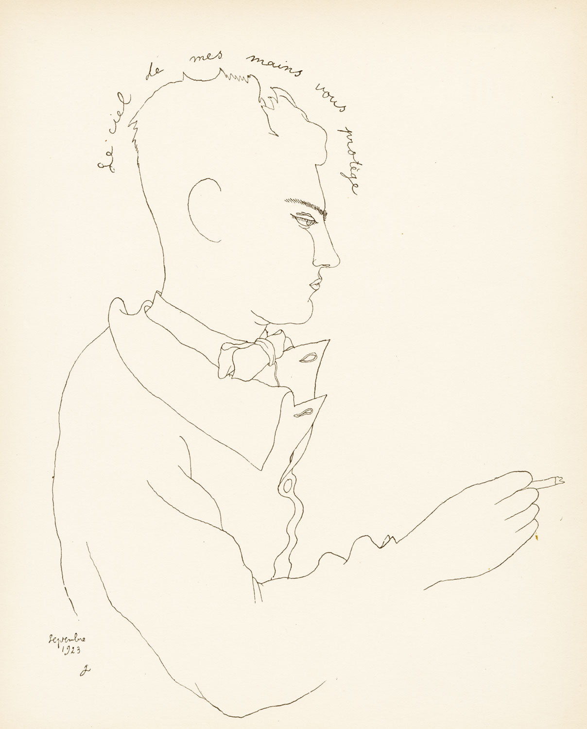 Published as a series of line cuts of Cocteau’s early drawings, dedicated to Picasso with the apology: “Poets do not draw. They untie the knots in handwriting and then retie them differently.”