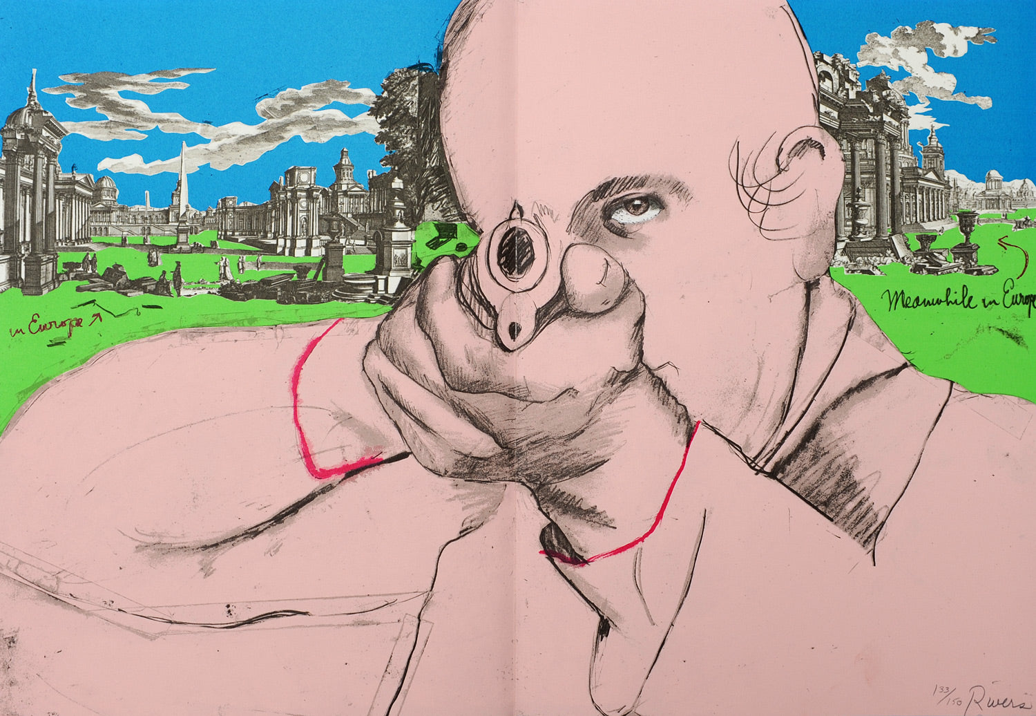 Rivers loads his images with post-modern tension, simultaneously celebrating and undermining the iconic historical imagery that is his subject. Redcoats painted pink, erotically suggestive bayonets, and crossed-out codpieces all draw attention to Rivers’ immersion in 1970s gay camp, in addition to other social concerns of his time, including the civil rights struggle and Vietnam. Rivers looked to the famous engraving, The Bloody Massacre Perpetrated in King Street, March 5, 1770, by silversmith Paul Revere.