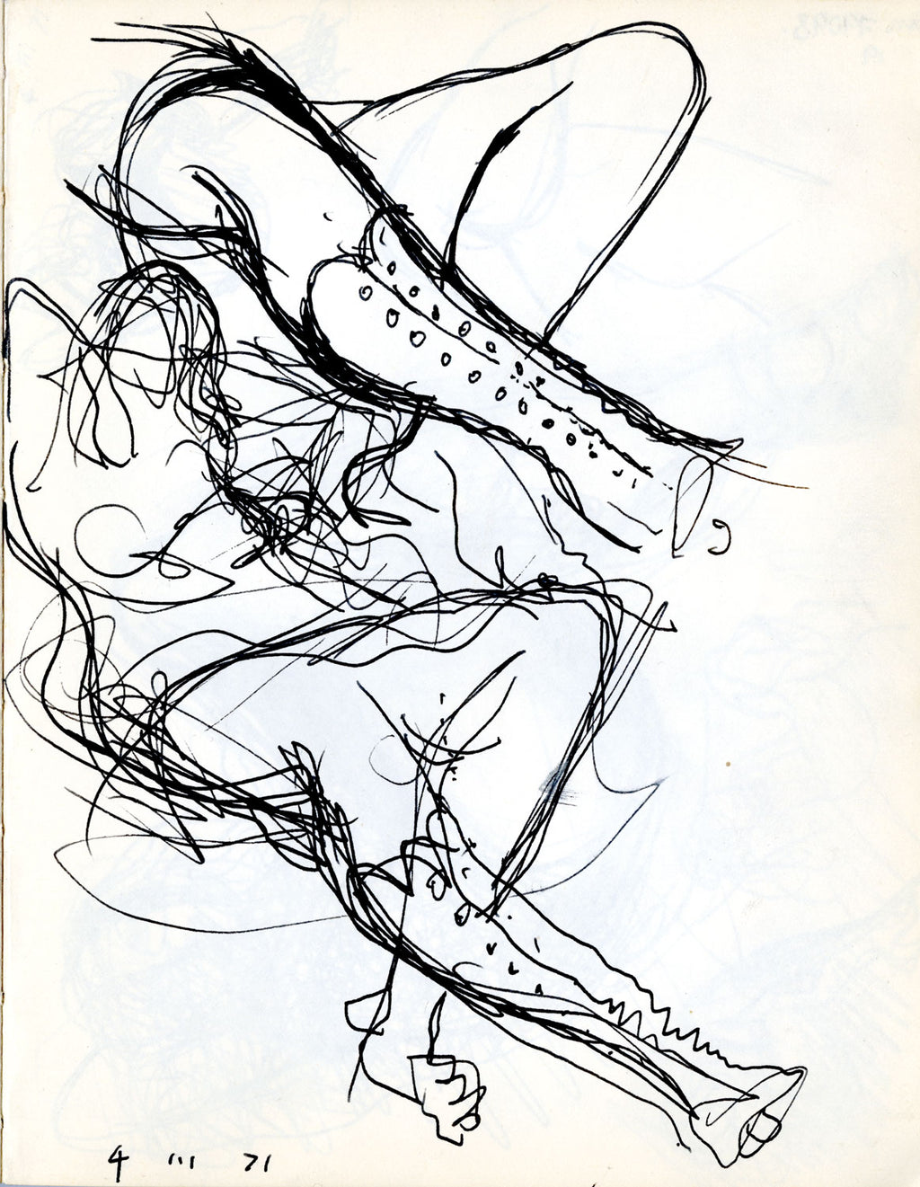 Wonderfully spontaneous drawing from John Piper’s c1971 sketchbook, available for sale for the first time, in which Piper can be seen to be working on ideas that he would later use in his Foliate Heads series of prints, the Eye and Camera series and his ceramic platters.