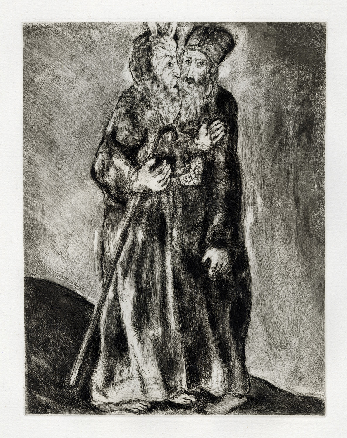 This etching is from Chagall’s sublime Bible series. Almost 10 years in the making, and comprising over 100 etchings, it was the third of Chagall’s etching suites to be commissioned by the publisher Ambroise Vollard. Chagall’s Jewish identity had always informed his work; in this major suite, begun in 1930, it was to take centre stage.