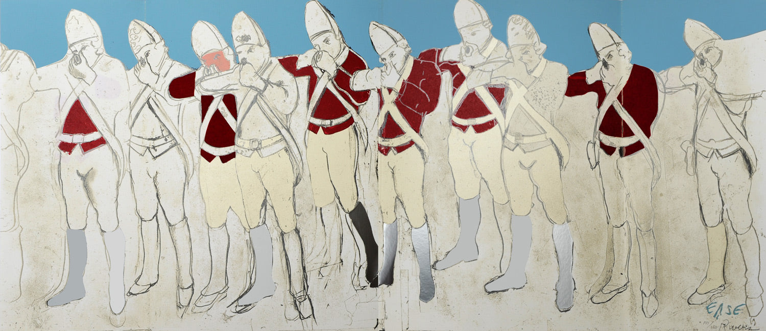 Rivers loads his images with post-modern tension, simultaneously celebrating and undermining the iconic historical imagery that is his subject. Redcoats painted pink, erotically suggestive bayonets, and crossed-out codpieces all draw attention to Rivers’ immersion in 1970s gay camp, in addition to other social concerns of his time, including the civil rights struggle and Vietnam. Rivers looked to the famous engraving, The Bloody Massacre Perpetrated in King Street, March 5, 1770, by silversmith Paul Revere.