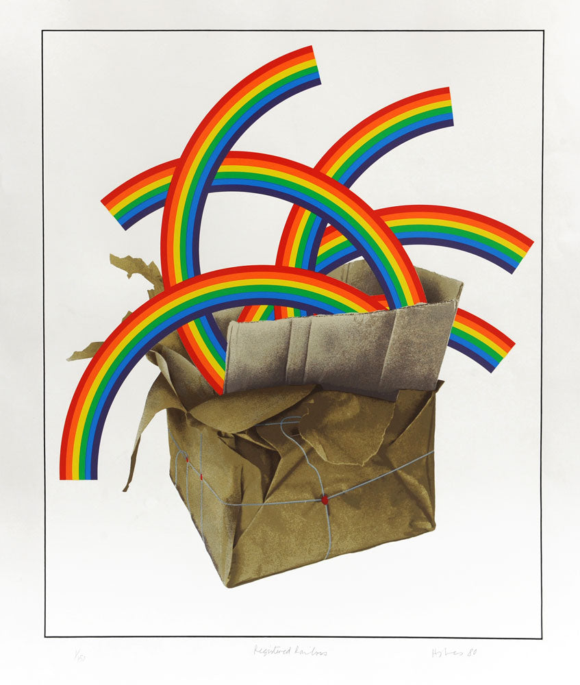 In the 1970s Hughes hung his investigations of perception and illusion on the motif of the rainbow in a series of paintings and prints. More recently he has been proccupied with reverse perspective or 'reverspective', three dimensional paintings that when viewed from the front initially give the impression of a painted flat surface that showing perspective. However this perspective changes dramatically as the viewer moves.