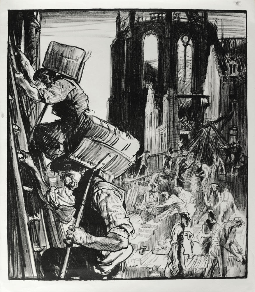 In the 1900s Brangwyn began designing furniture, textiles, ceramics and other media. He was made an Official War artist in World War I, gaining repute through his posters, and was further recognised with an RA appointment (1919) and a knighthood (1941). Brangwyn was given a major retrospective exhibition at the Royal Academy, the first time this honour had been accorded to a living artist.