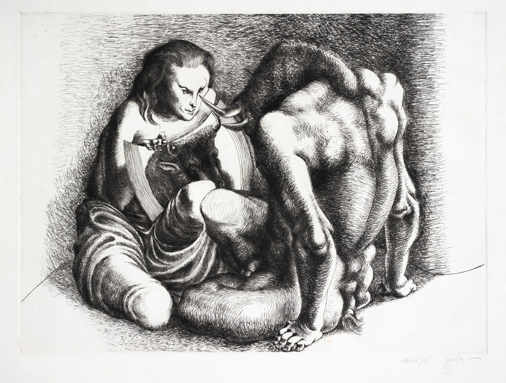 The minotaur was a powerful archetype which occupied Michael Ayrton for over ten years of his artistic life. Beginnning in 1961, Ayrton wrote and created many works associated with the myths of the Minotaur and Daedalus, the legendary inventor and maze builder. Works include bronze sculpture, the autobiographical novel 'The Maze Maker' (1967), and the 'Minotaur' Etchings (1971).