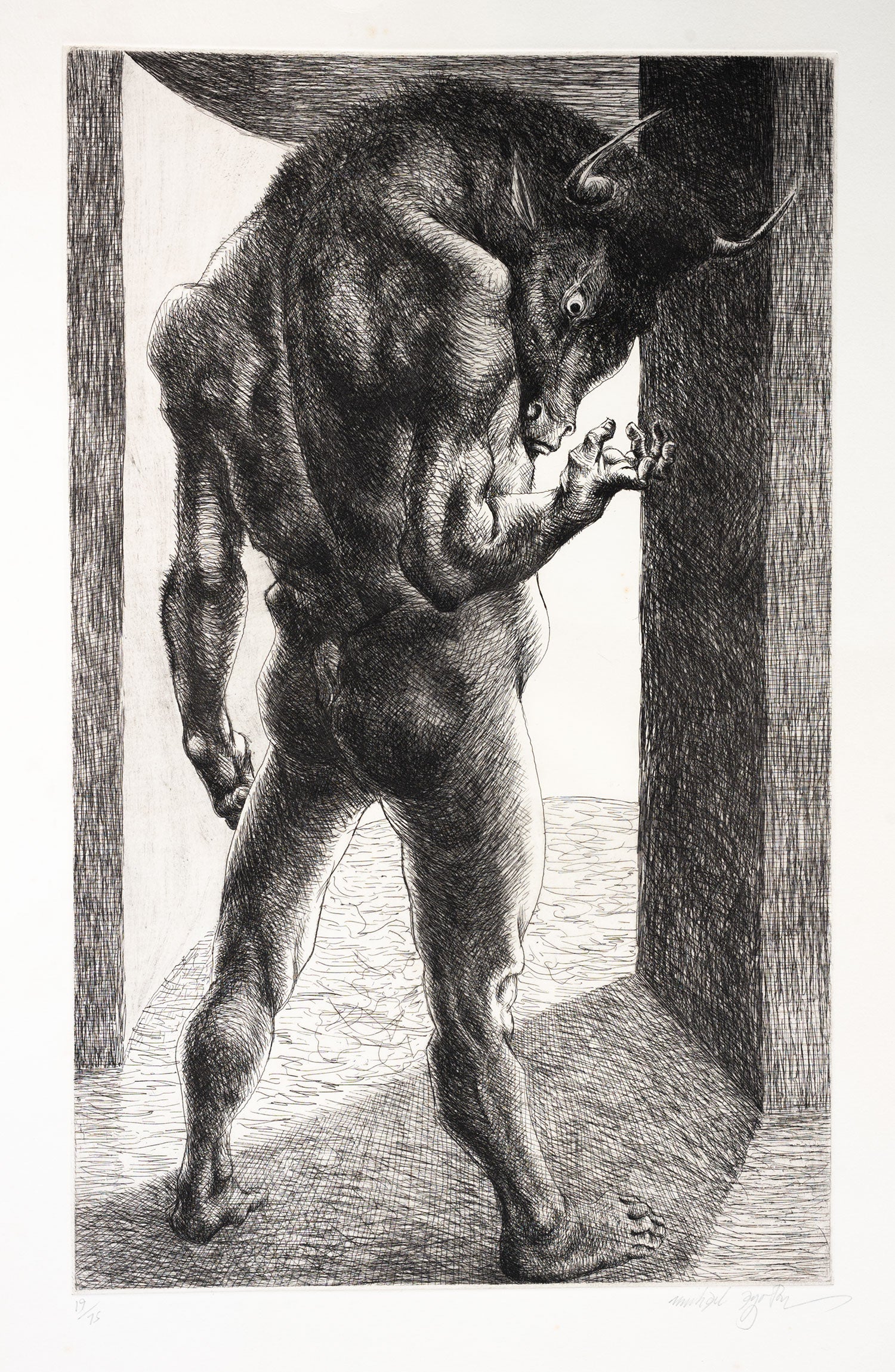 'At the centre of the Maze, in all meanings of the expression, is the Minotaur, and Michael Ayrton’s identification of himself with the Minotaur, as well as with Daedalus, lies at the root of his compulsive image. Half bull and half man, the Minotaur stands isolated among the hybrids of the Classical World, since he alone possesses an animal’s head attached to a human body. Whereas Satyrs and Centaurs symbolize the animal urges of man, held in check by civilization, the Minotaur represents, in the words of John Berger, the animal in captivity of an almost human form, and, the suffering which is caused by aspiration and sensibility being rejected because they exist in an unattractive, that is so untamed, uncivilized body. Either way the Minotaur suggests a criticism of civilisation, which inhibits him in the first case and dismiss him in the second.