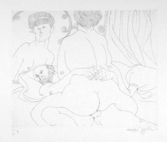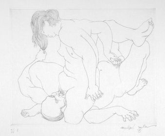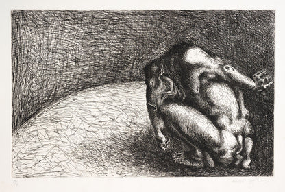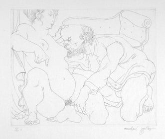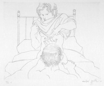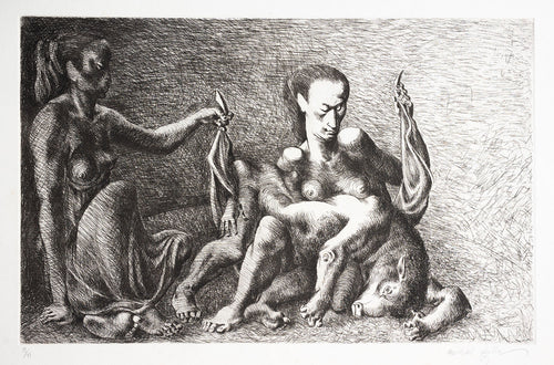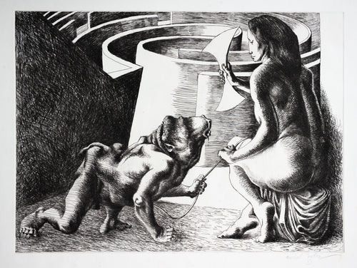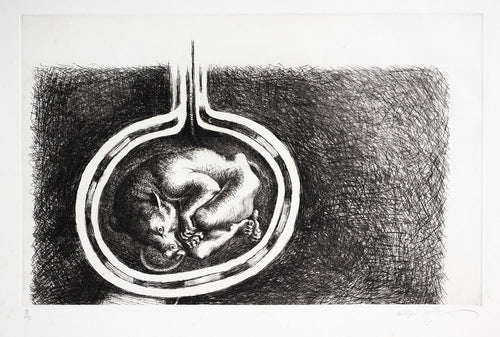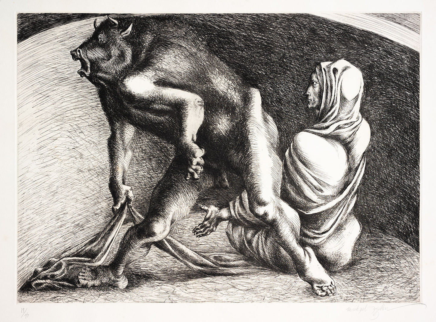 The minotaur was a powerful archetype which occupied Michael Ayrton for over ten years of his artistic life. Beginnning in 1961, Ayrton wrote and created many works associated with the myths of the Minotaur and Daedalus, the legendary inventor and maze builder. Works include bronze sculpture, the autobiographical novel 'The Maze Maker' (1967), and the 'Minotaur' Etchings (1971).