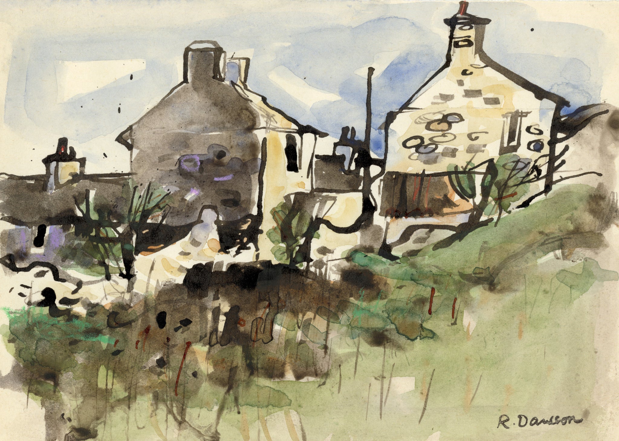Estate stamp signed watercolour with pen and ink on paper.