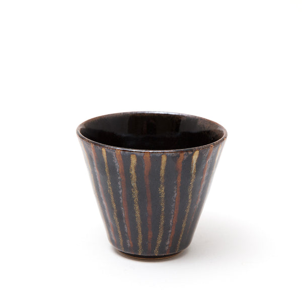 Dots and lines find a natural rhythm on guinomi and small vases, while the lustrous surfaces of persimmon platters are softened by mossy Yōhen ash.