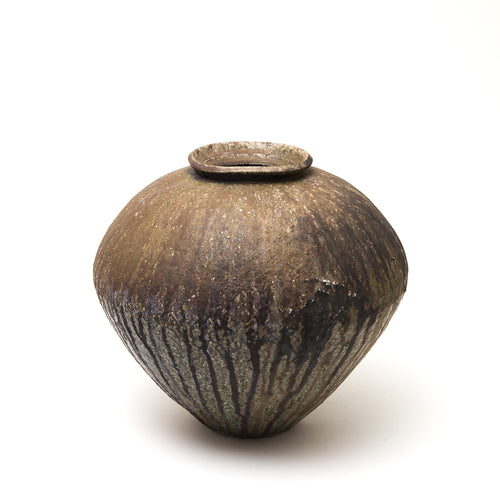 His square-lipped pouring bowls are refined with a touch that belies the coarseness of his clay, while blushing wood-fired porcelain bottles shimmer with pink and purple pearlescence.