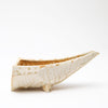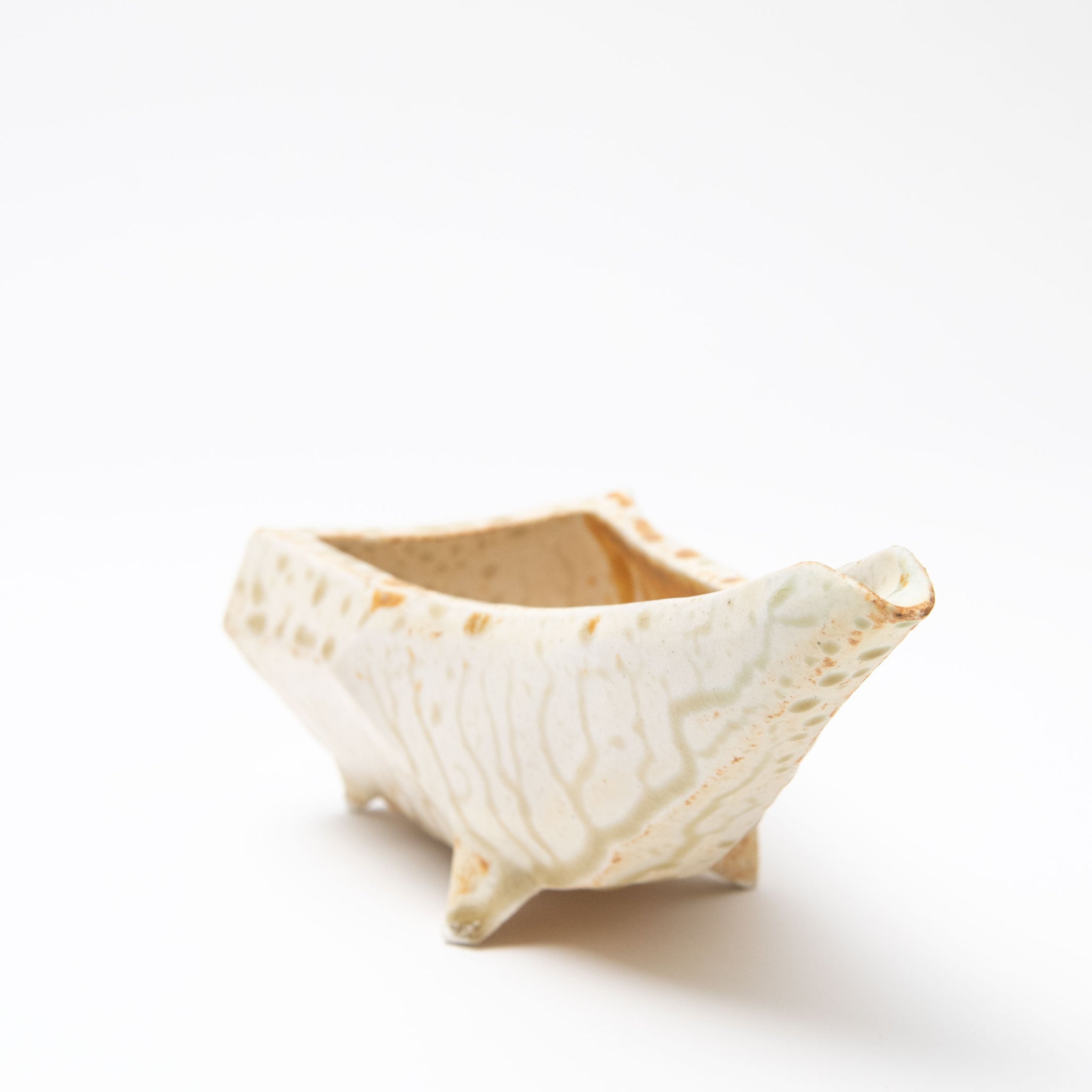 Her sake ‘monsters’ combine Jurassic dinosaur bodies with dainty beaks and curled up feet, while her jungle-green Oribe, cresting and pooling into opaque aquamarine blue, is a thing of prehistoric beauty.