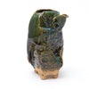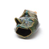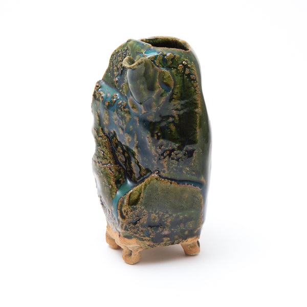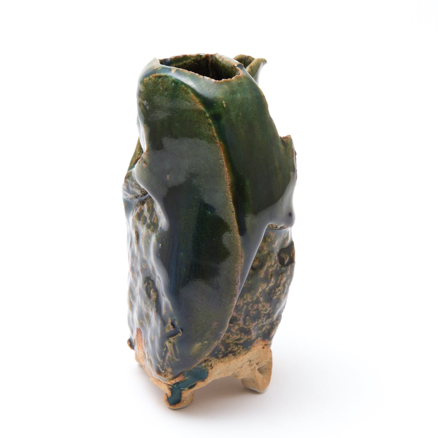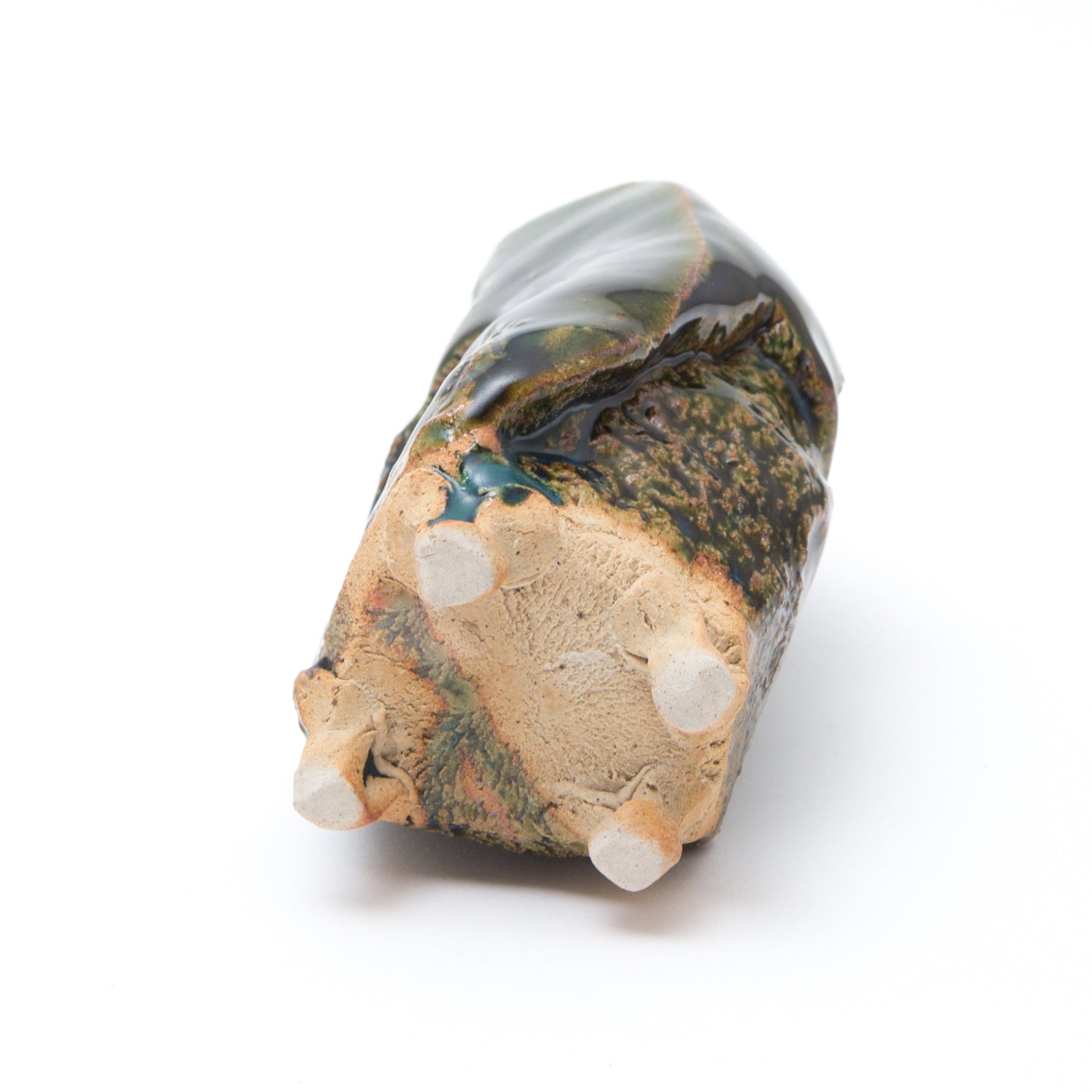 Her sake ‘monsters’ combine Jurassic dinosaur bodies with dainty beaks and curled up feet, while her jungle-green Oribe, cresting and pooling into opaque aquamarine blue, is a thing of prehistoric beauty.