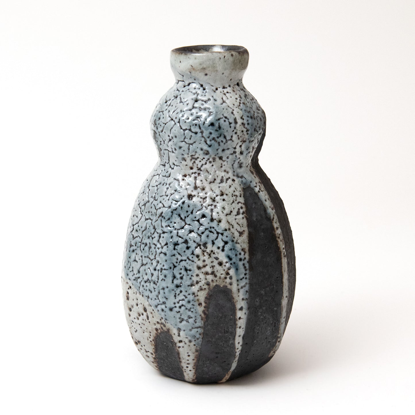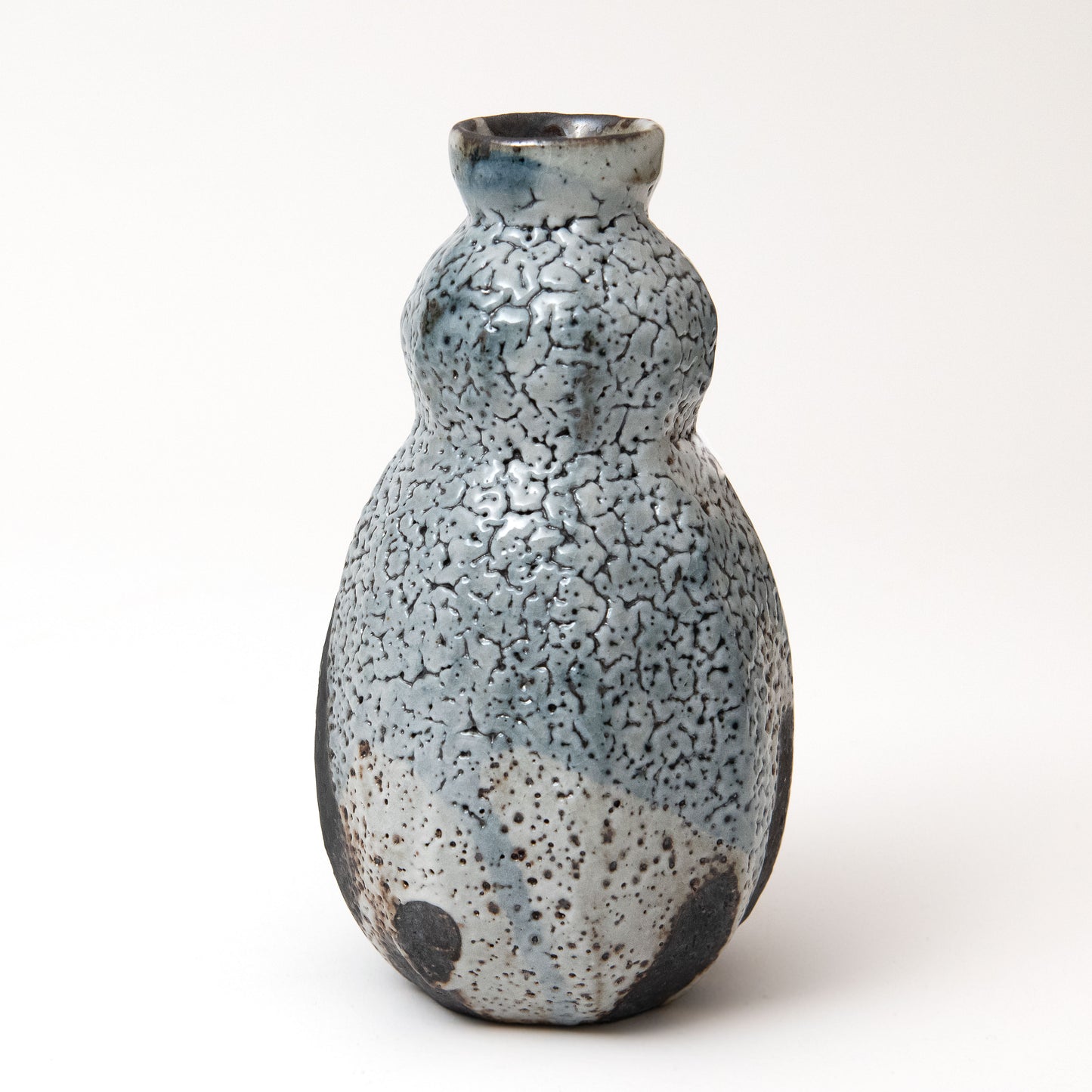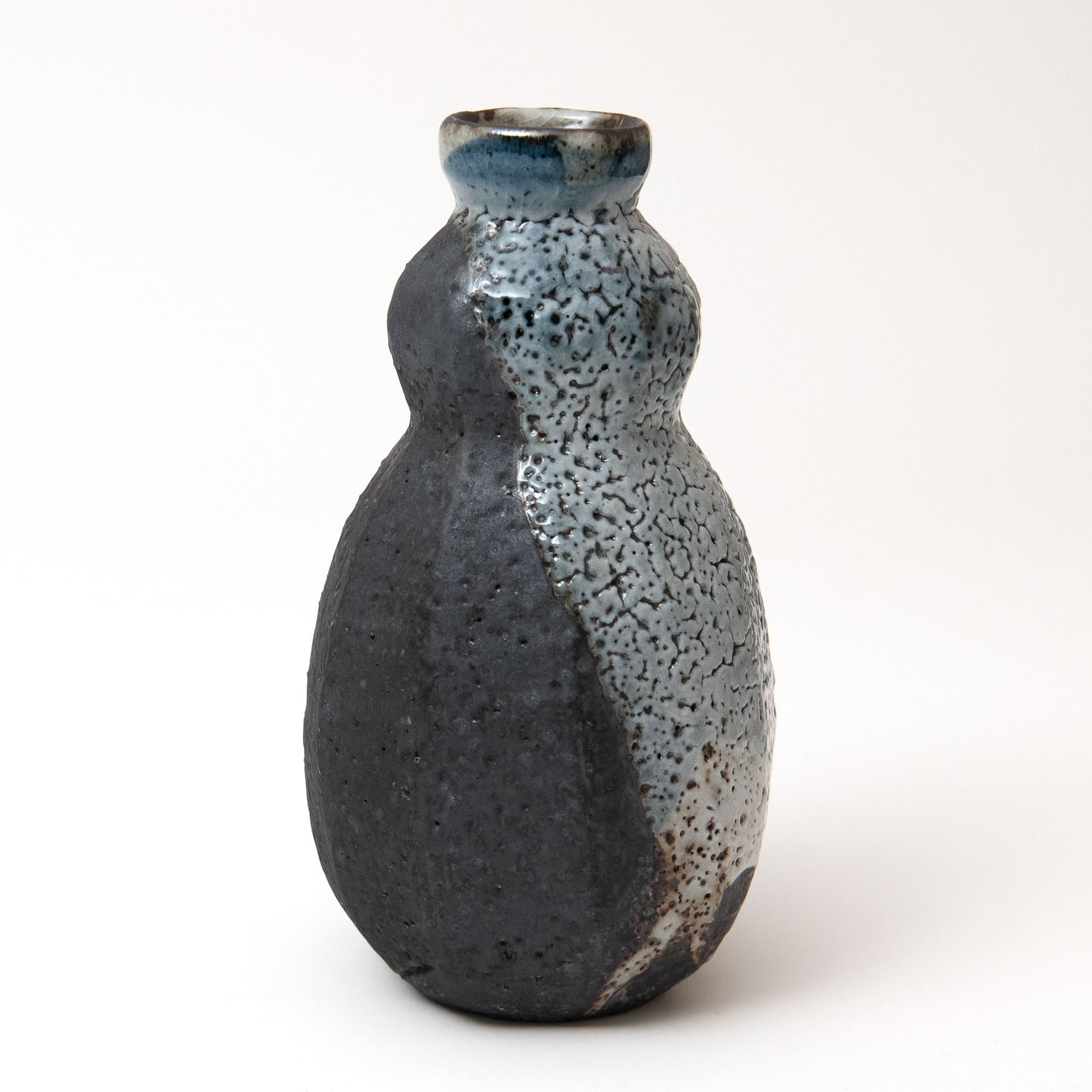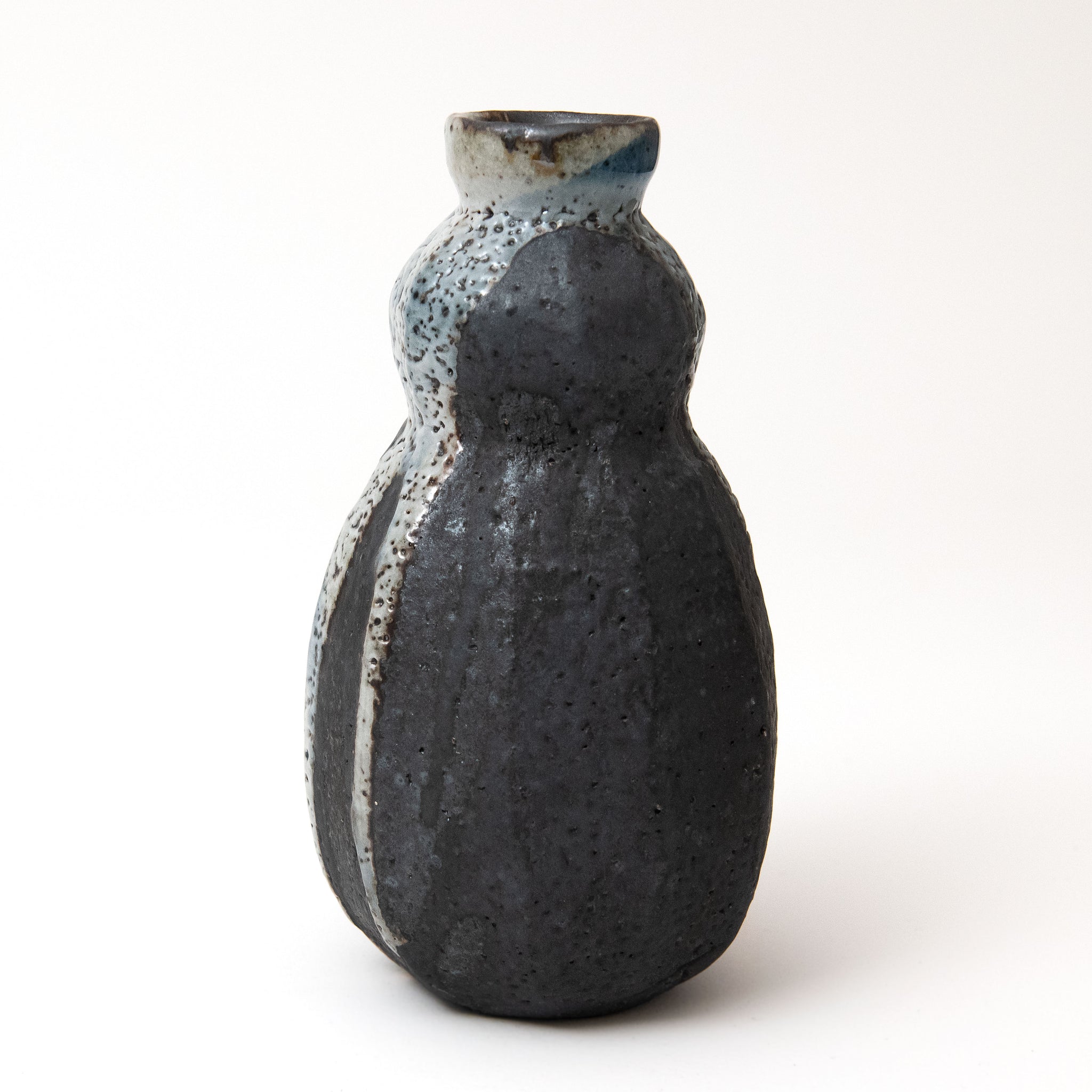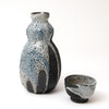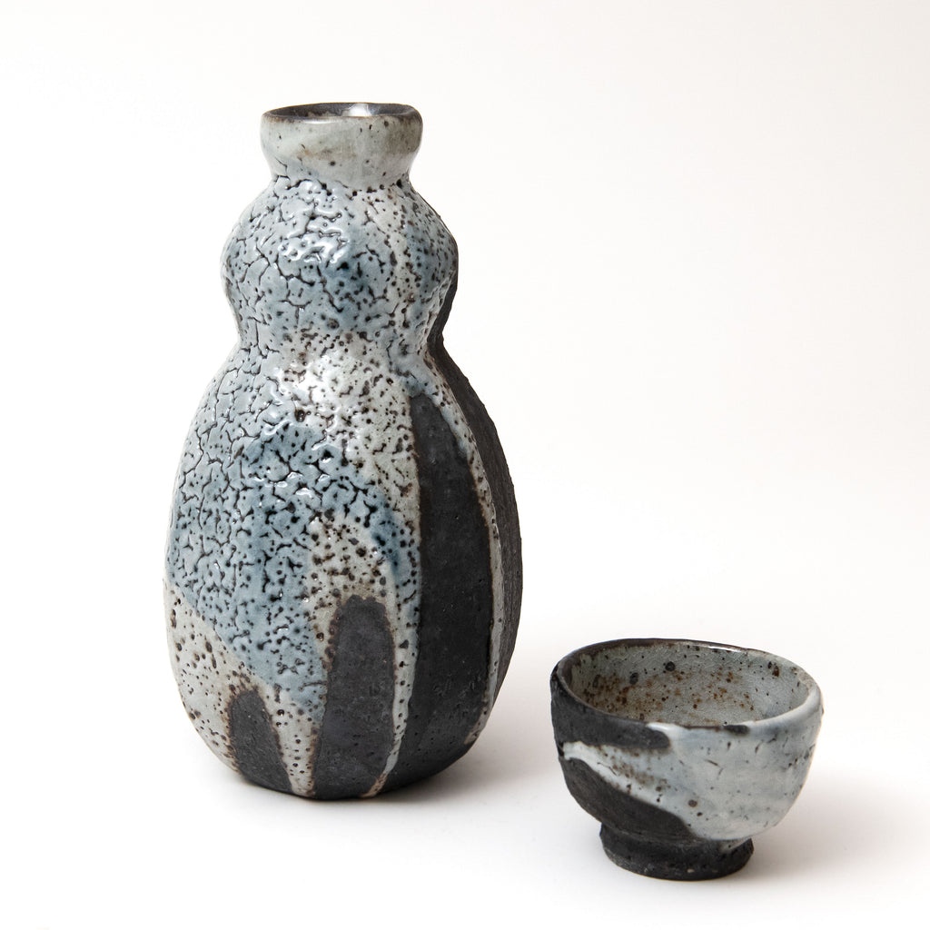Faceted gourd shaped bottle and one cup. Black clay and poured blue shino