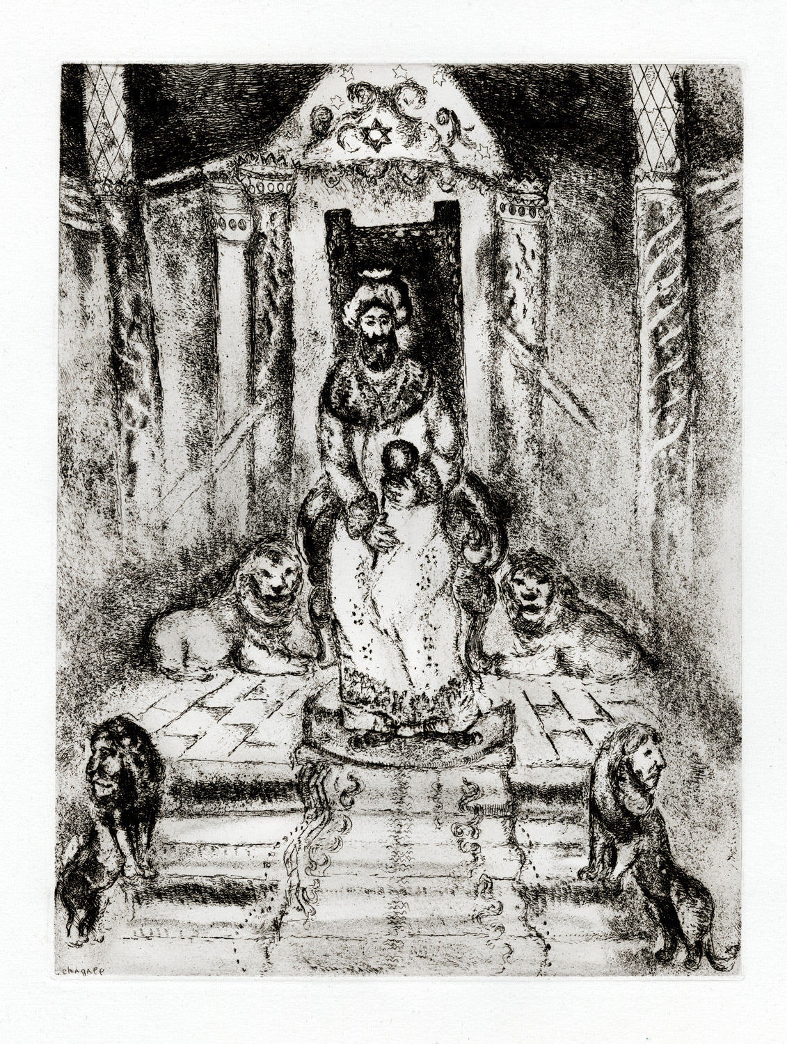 This etching is from Chagall’s sublime Bible series. Almost 10 years in the making, and comprising over 100 etchings, it was the third of Chagall’s etching suites to be commissioned by the publisher Ambroise Vollard. Chagall’s Jewish identity had always informed his work; in this major suite, begun in 1930, it was to take centre stage.