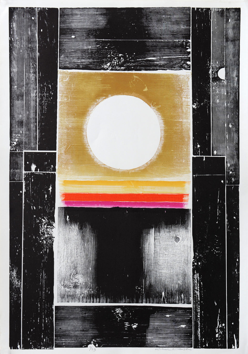 Rothenstein became one of the most experimental printmakers in Britain during the ‘50s and ’60s. As well as found objects such as wood offcuts and metal debris, he incorporated fresh 20th century imagery into his relief prints, combining photographic material with traditional woodcuts and linocuts. Numerous major galleries currently hold his work and he was made Hon. RE and elected RA in 1983.
