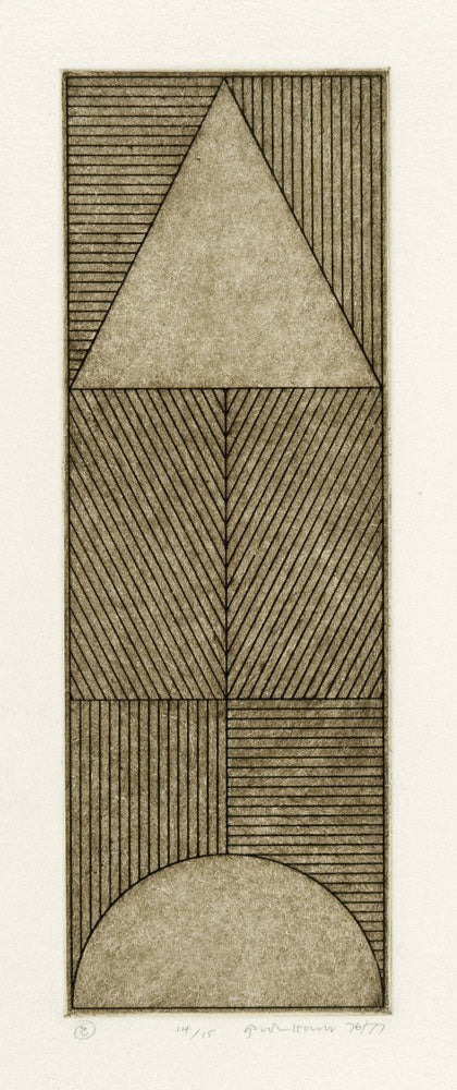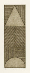 This suite of etchings, begun in 1973 uses various combinations of three elements: the triangle, arc and semi-circle; all set within a rigid grid formation.