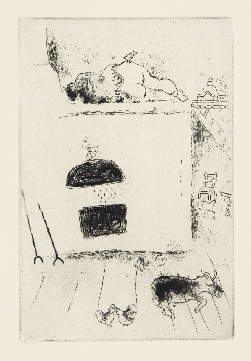 Returning to Paris in 1923 he met the art-dealer Vollard for whom he illustrated Gogol’s Dead Souls and the Fables of La Fontaine. Between 1941-47 he moved between occupied France and the USA, eventually settling near Nice. Chagall was a prolific artist, his work reminiscent of Jewish life, bible stories and of the folklore from his early years in Russia. He died in 1985.
