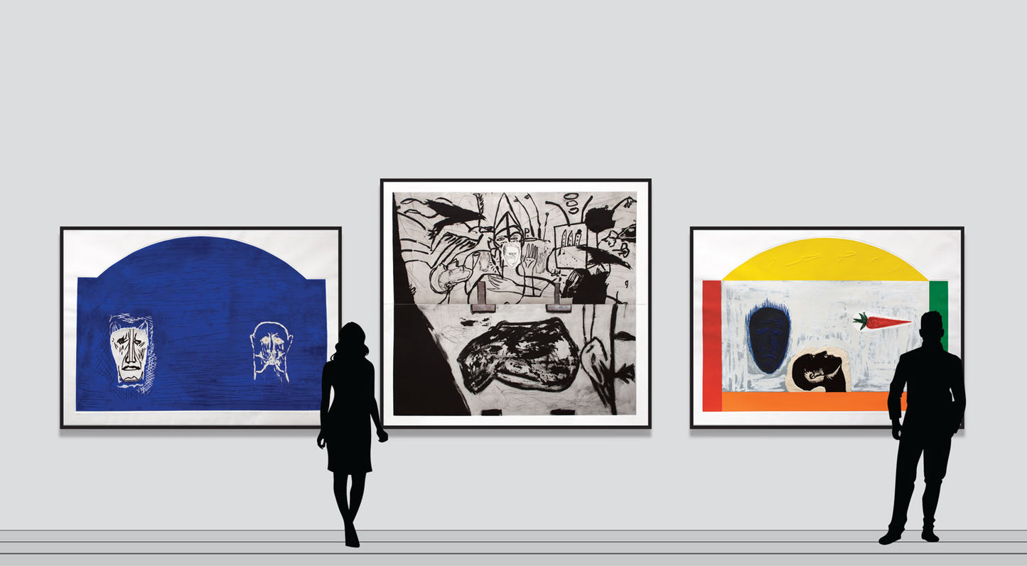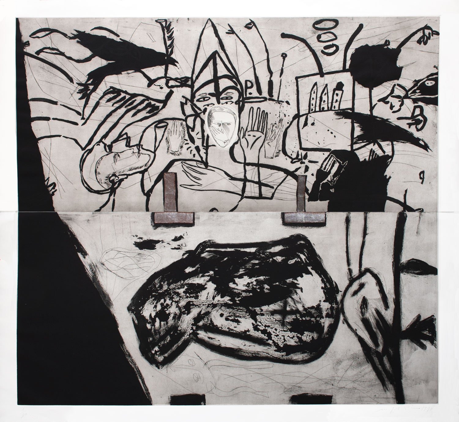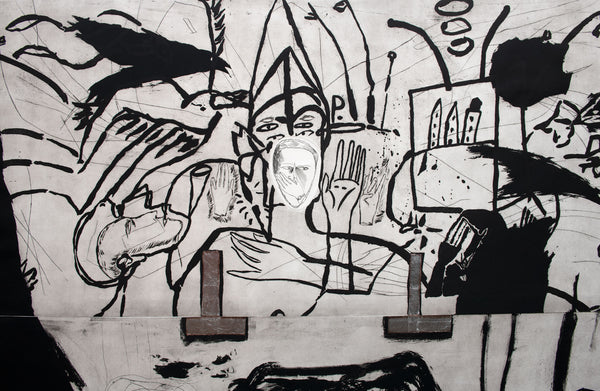 Extra large signed and numbered original etching, aquatint, drypoint and collage, printed over two sheets, which are taped together verso by strong tape by the printers.