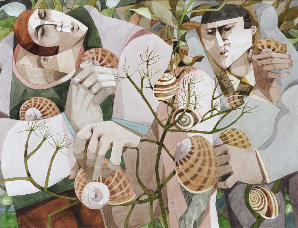 Human figures are important components in Large’s compositions, often men at work, and the work of Edward Burra and Stanley Spencer has been influential upon Large’s art. He has held several solo exhibitions and was commissioned to do a mural for Kings Cross Thameslink Station. In recent years he has lived and painted in Rutland and Malta.