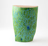 The amazing ridges and facets produced by the log-splitting machine are remarkable and, in Martin's experience, unique. The smooth, rounded under-bark surface was, in contrast, almost featureless, so it was decided to use colour over all of it. The acrylic was applied with an oak leaf shaped stamp.