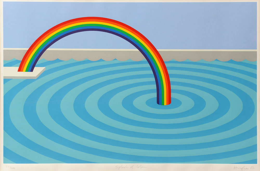 In the 1970s Hughes hung his investigations of perception and illusion on the motif of the rainbow in a series of paintings and prints. More recently he has been proccupied with reverse perspective or 'reverspective', three dimensional paintings that when viewed from the front initially give the impression of a painted flat surface that showing perspective. However this perspective changes dramatically as the viewer moves.