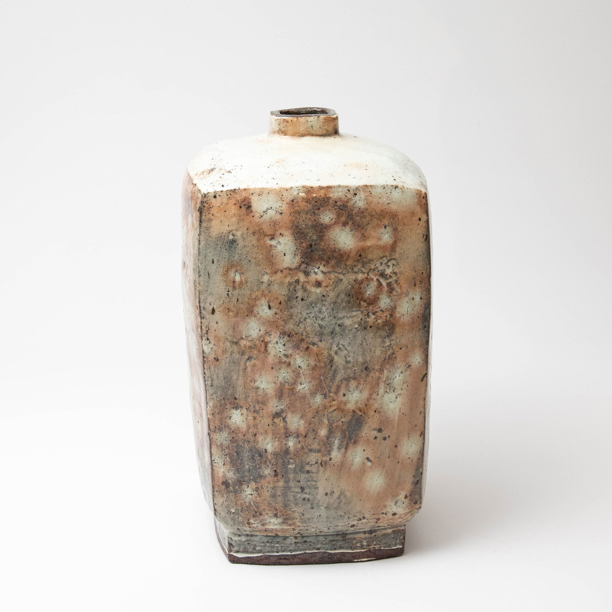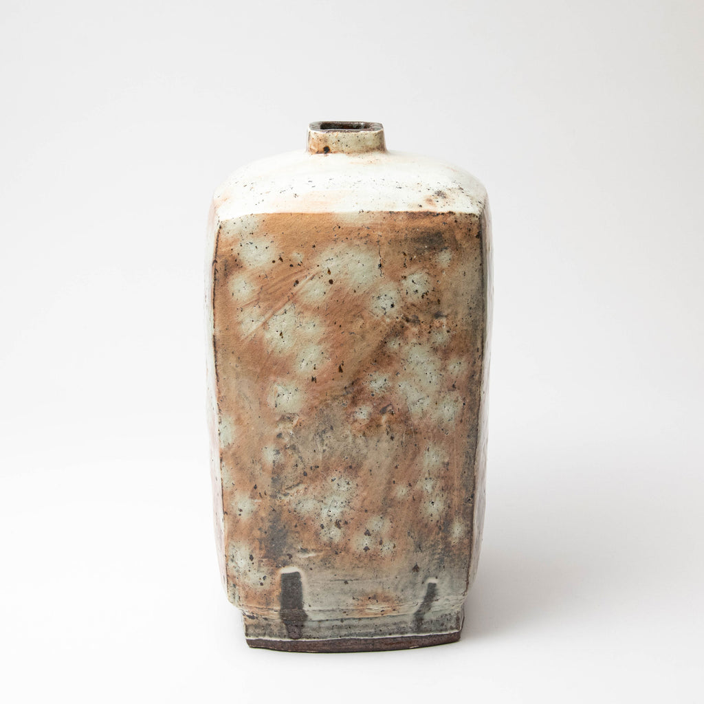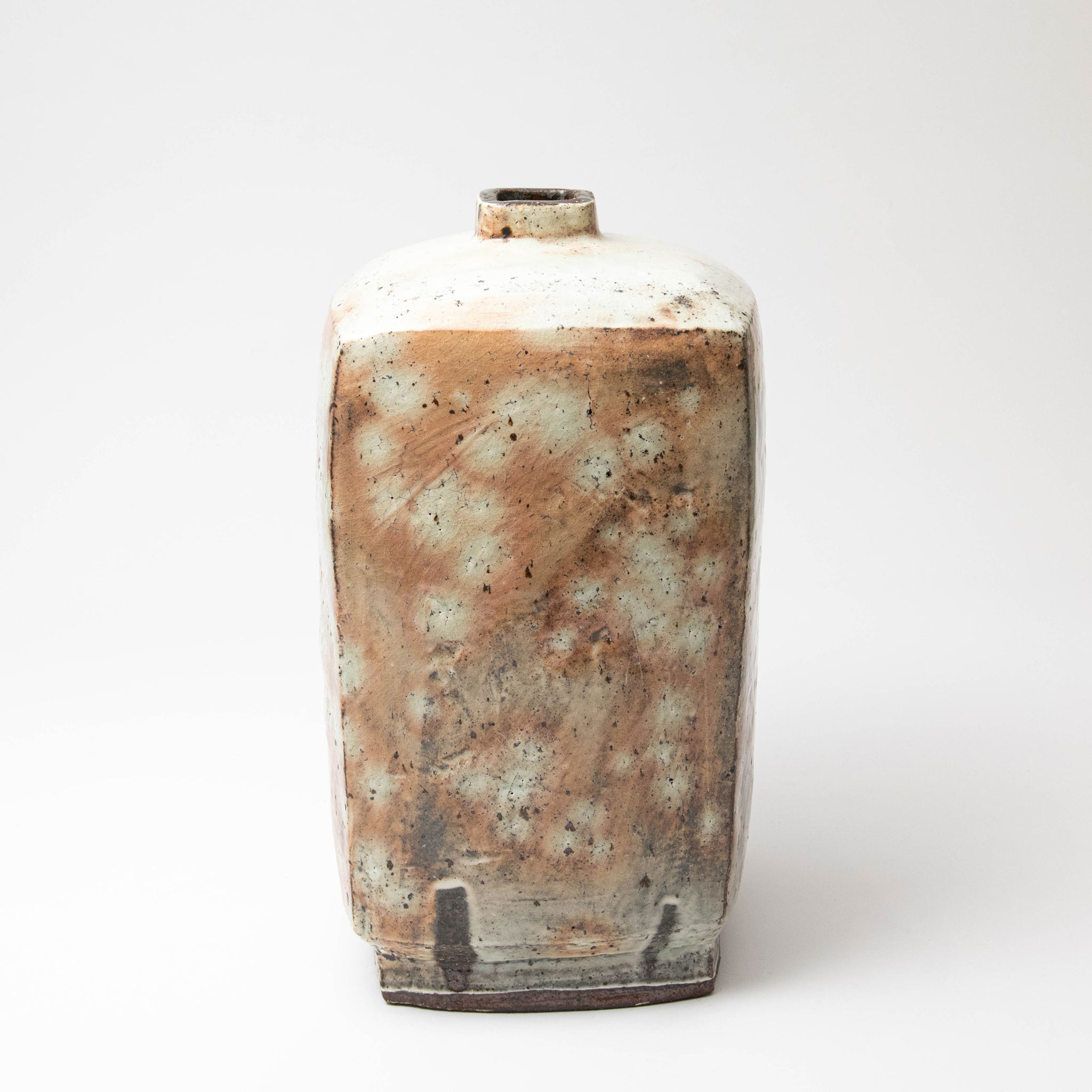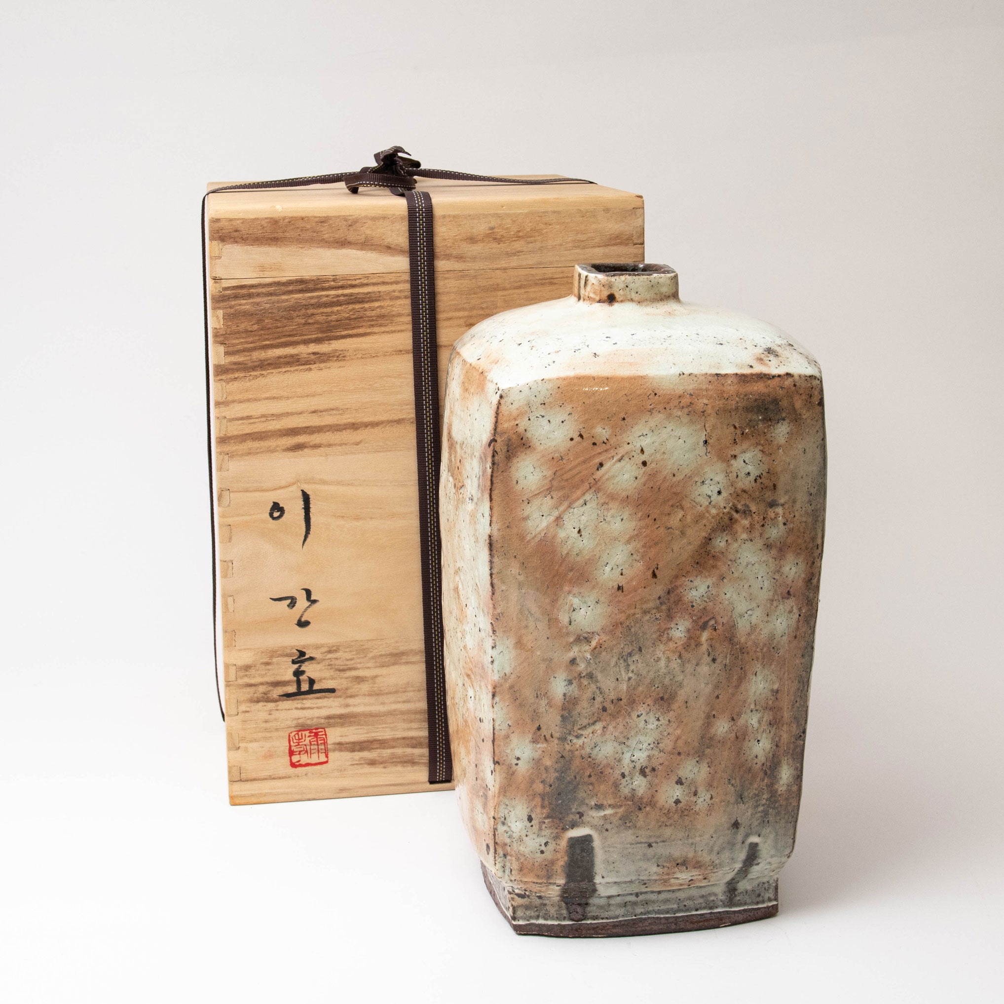 Lee decorates his pots using the traditional Korean method of Punch'ŏng. White slip is applied to a dark stoneware body. Whilst it is still wet Lee uses his hands to spread it over the pot, using tools to incise the slip in expressive motions.