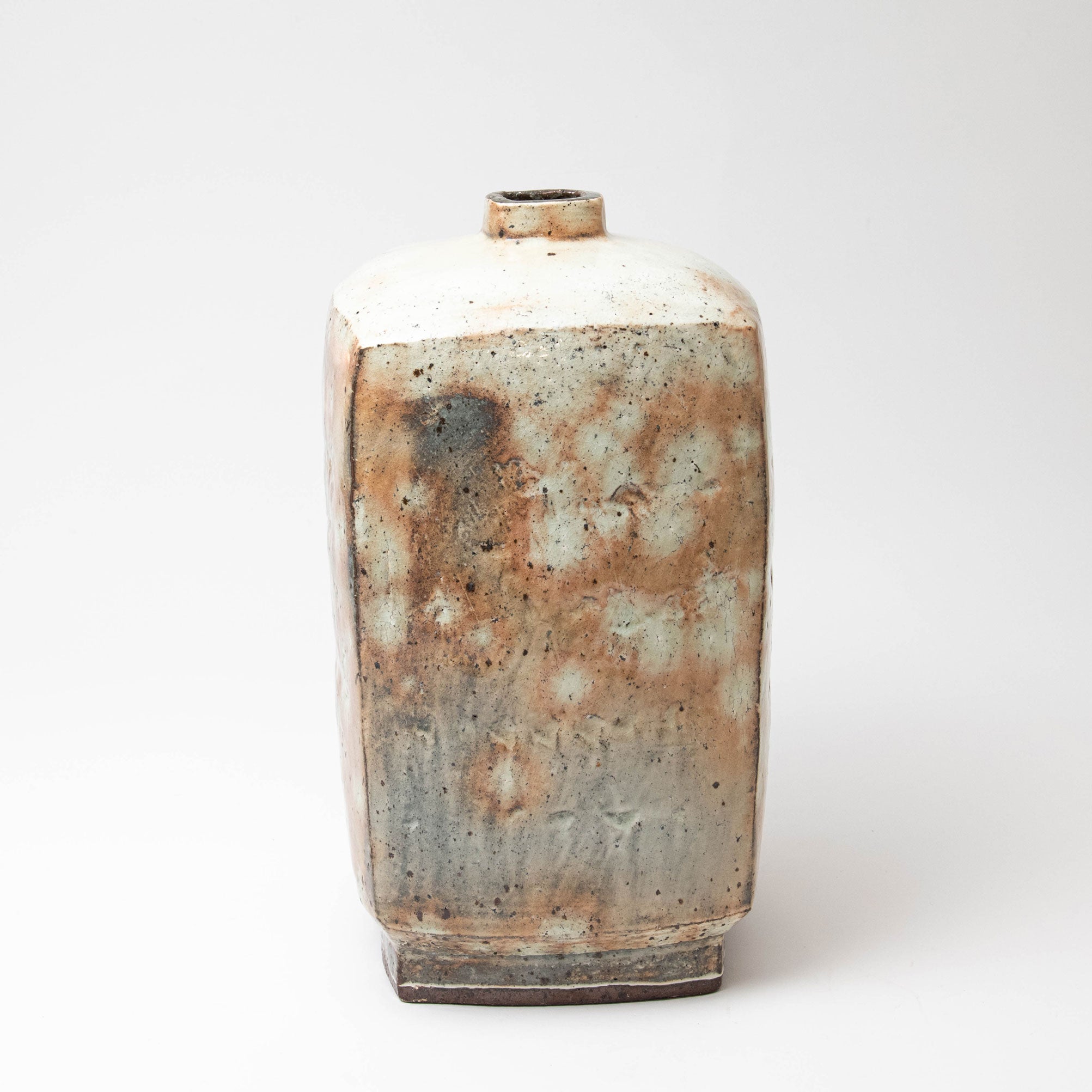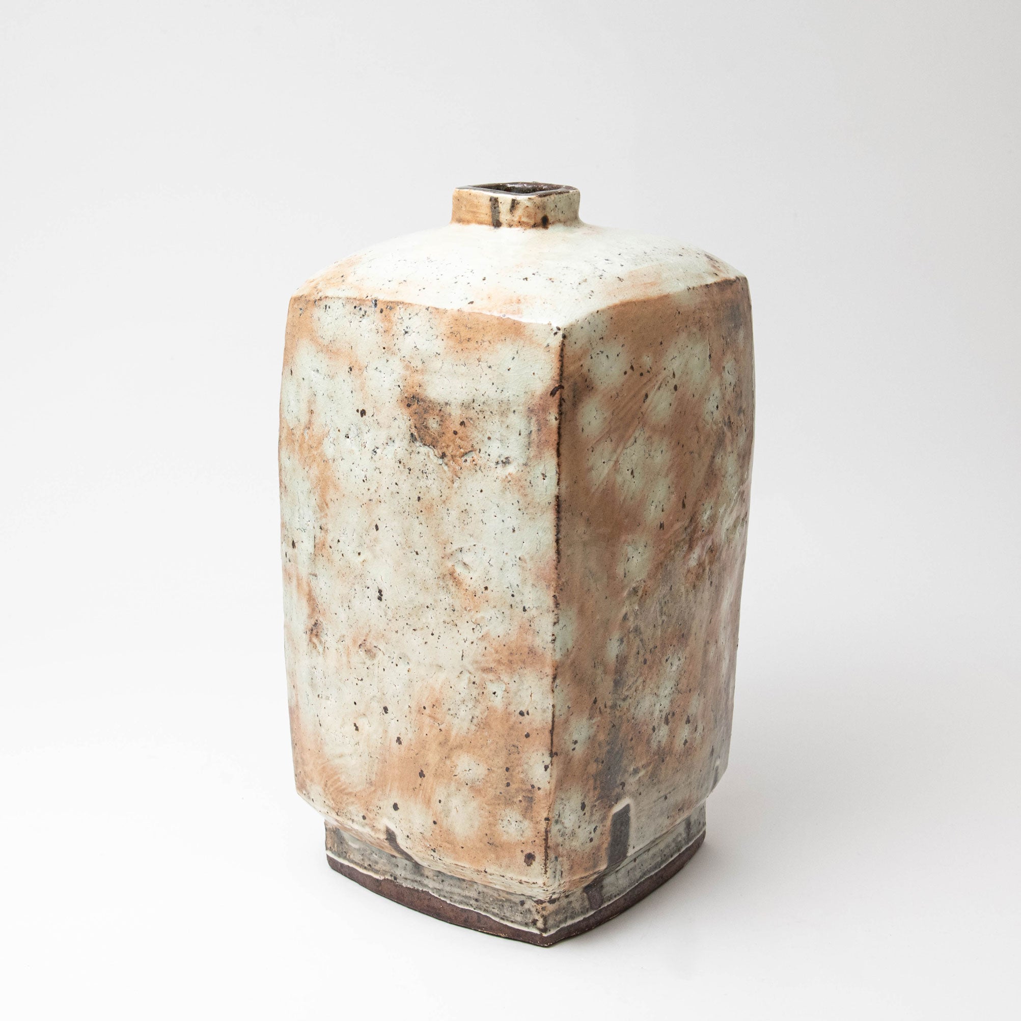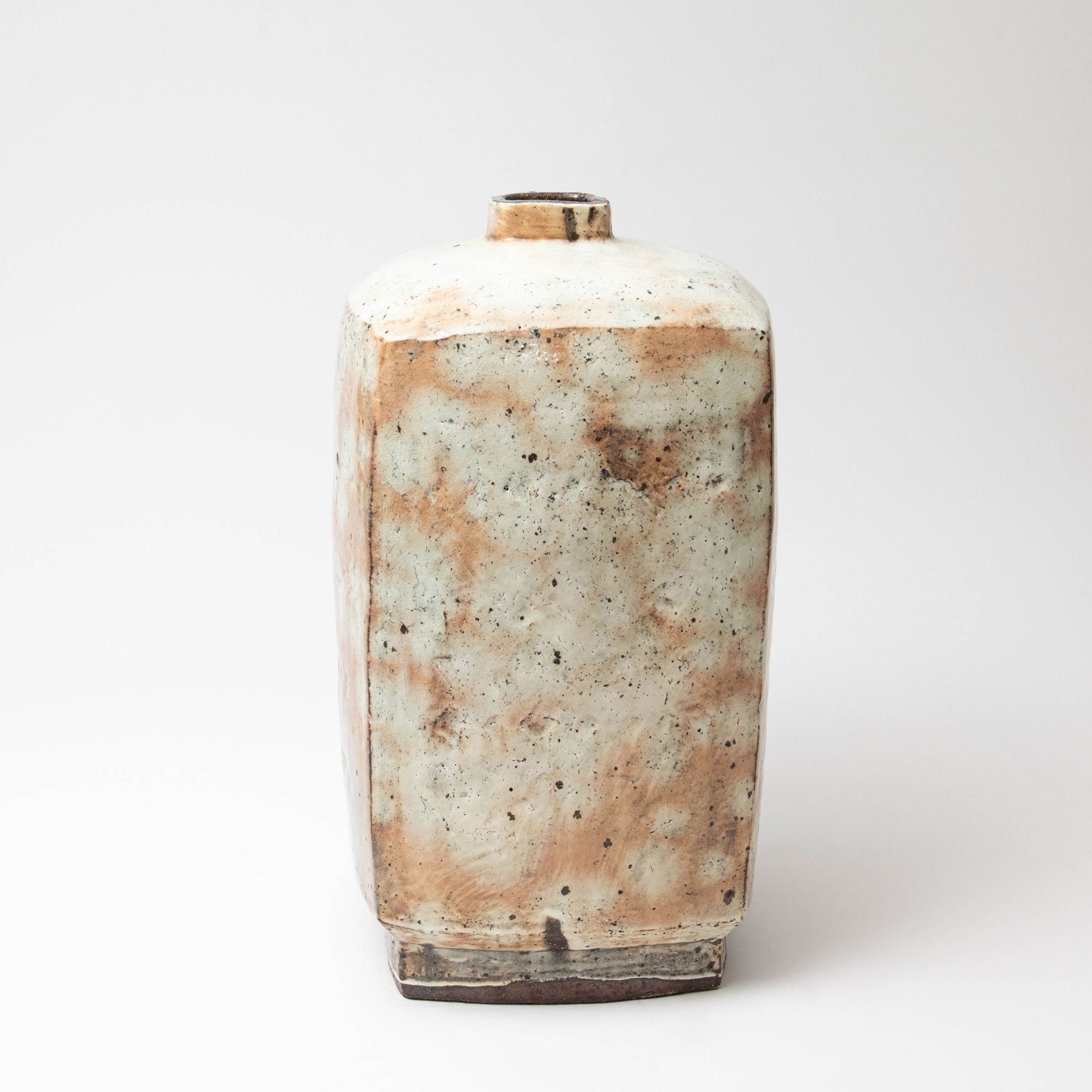 Lee decorates his pots using the traditional Korean method of Punch'ŏng. White slip is applied to a dark stoneware body. Whilst it is still wet Lee uses his hands to spread it over the pot, using tools to incise the slip in expressive motions.