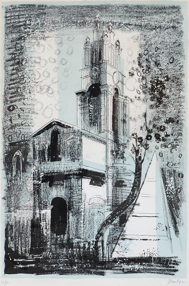 Piper experimented with printmaking from as early as 1923 when he produced four wood engravings. Piper’s prints embody his love of Britain through their depiction of its art, architecture and topography. However frequently underpinning their design, as the artist Rigby Graham has indicated, are the elements of collage, construction and assemblage that featured in his modernist work of the early 1930s.