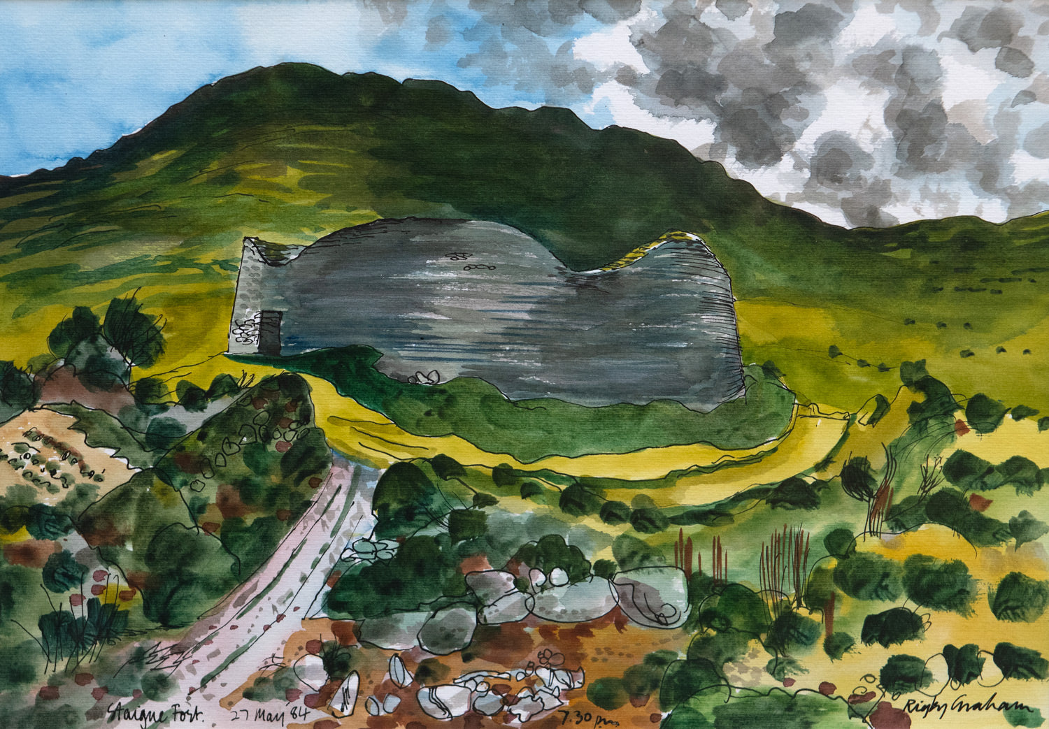 Staigue is a ruined stone ringfort three miles west of Sneem, on the Iveragh peninsula in County Kerry, Ireland. The fort is thought to have been built during the late Iron Age, probably somewhere between 300 and 400 AD, as a defensive stronghold for a local lord or king.