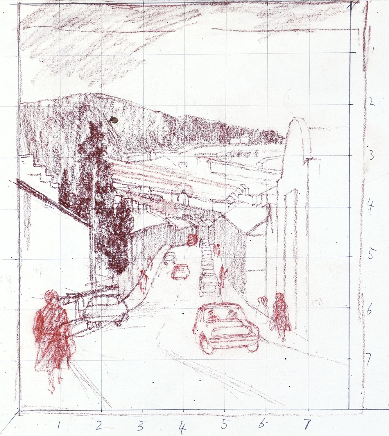 Pencil and crayon draft for a street scene, possibly Rhondda Valley. From the collection of Lola Chapman, George Chapman's granddaughter.