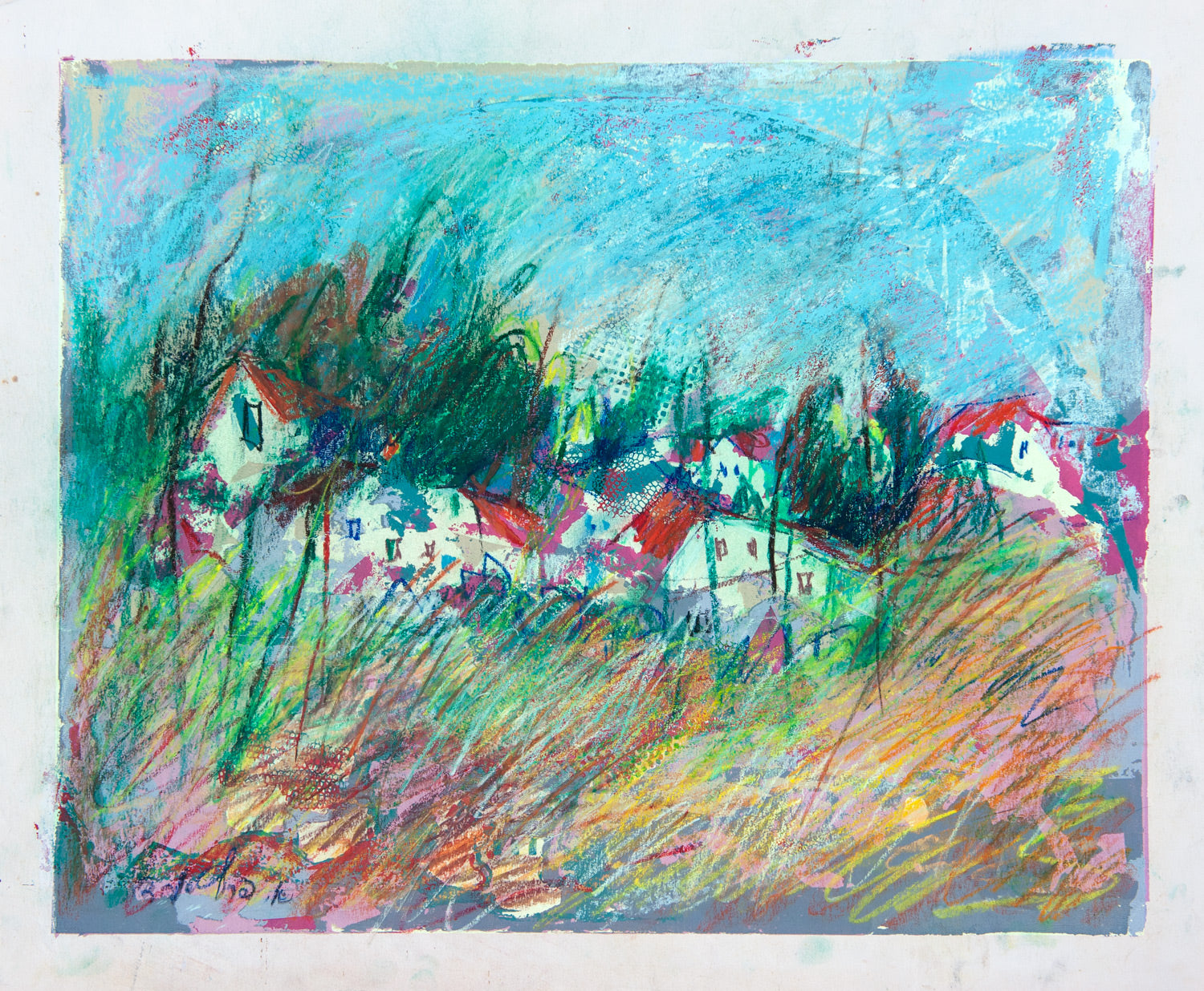 Signed mixed media, including screenprint with over working of pastel, wax crayon and chalk.