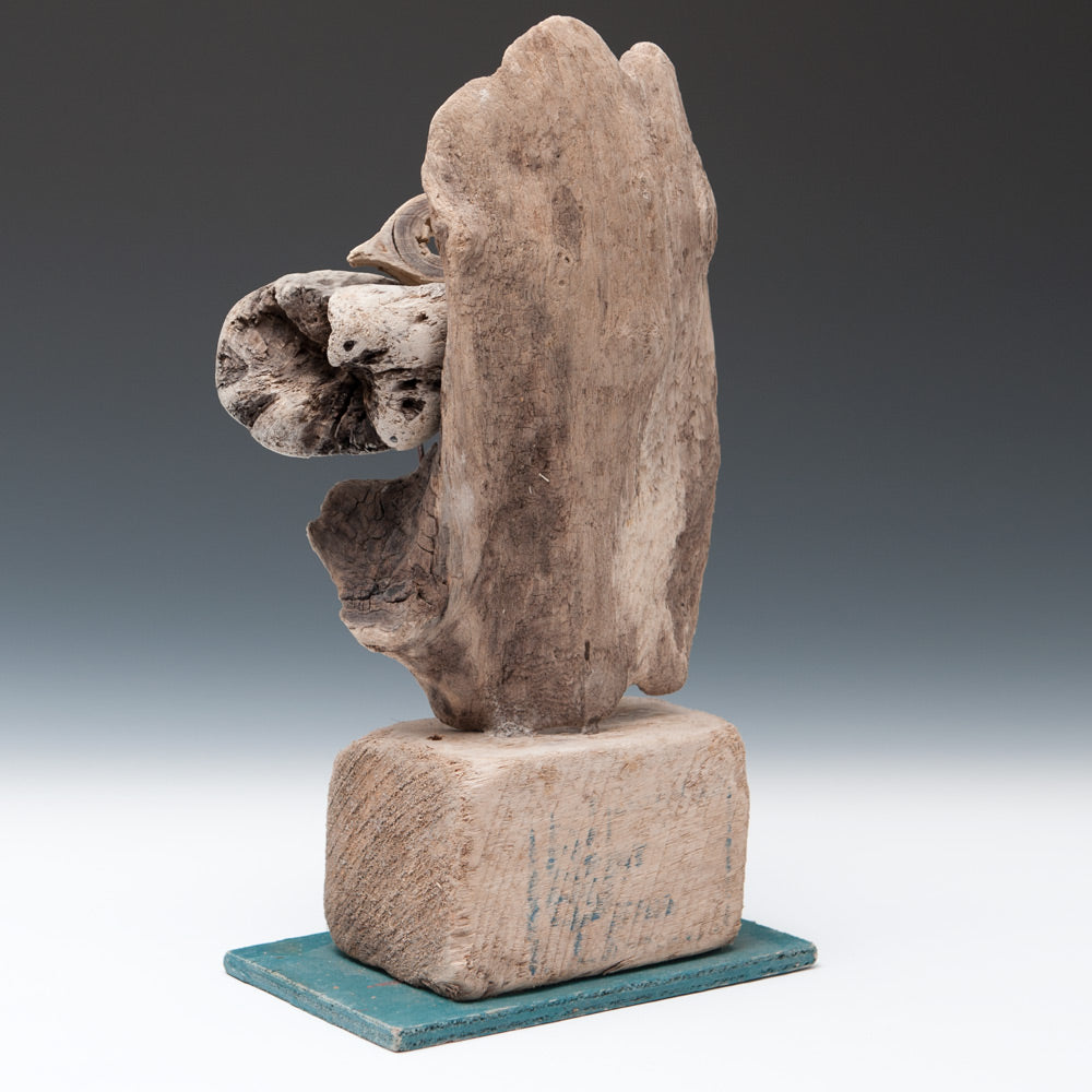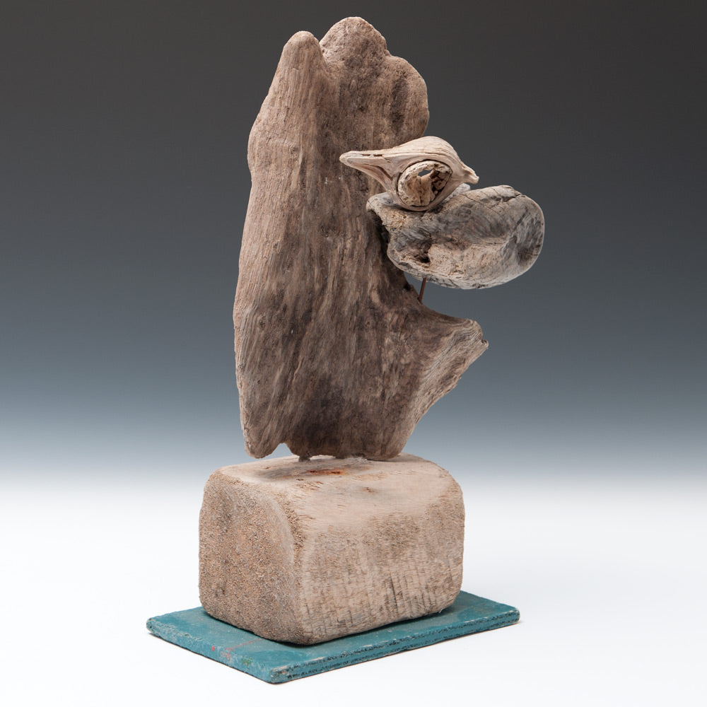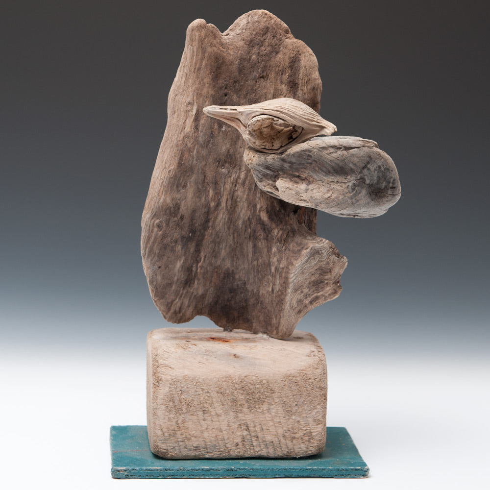 He is now based in Borth near Aberystwyth in Wales, where the flotsam and jetsam from the nearby sea is his only source of materials. Working with found objects, nothing is changed - simply introduced to one another. His driftwood pieces, usually birds, boats or mythical beasts, are full of his passion, integrity and wonderful humour.
