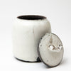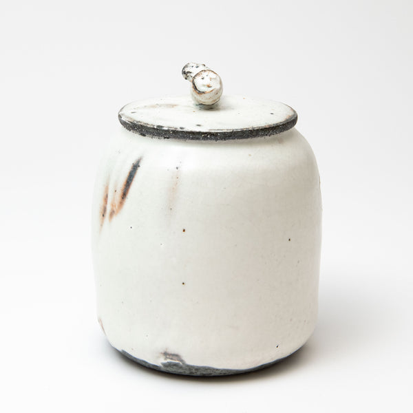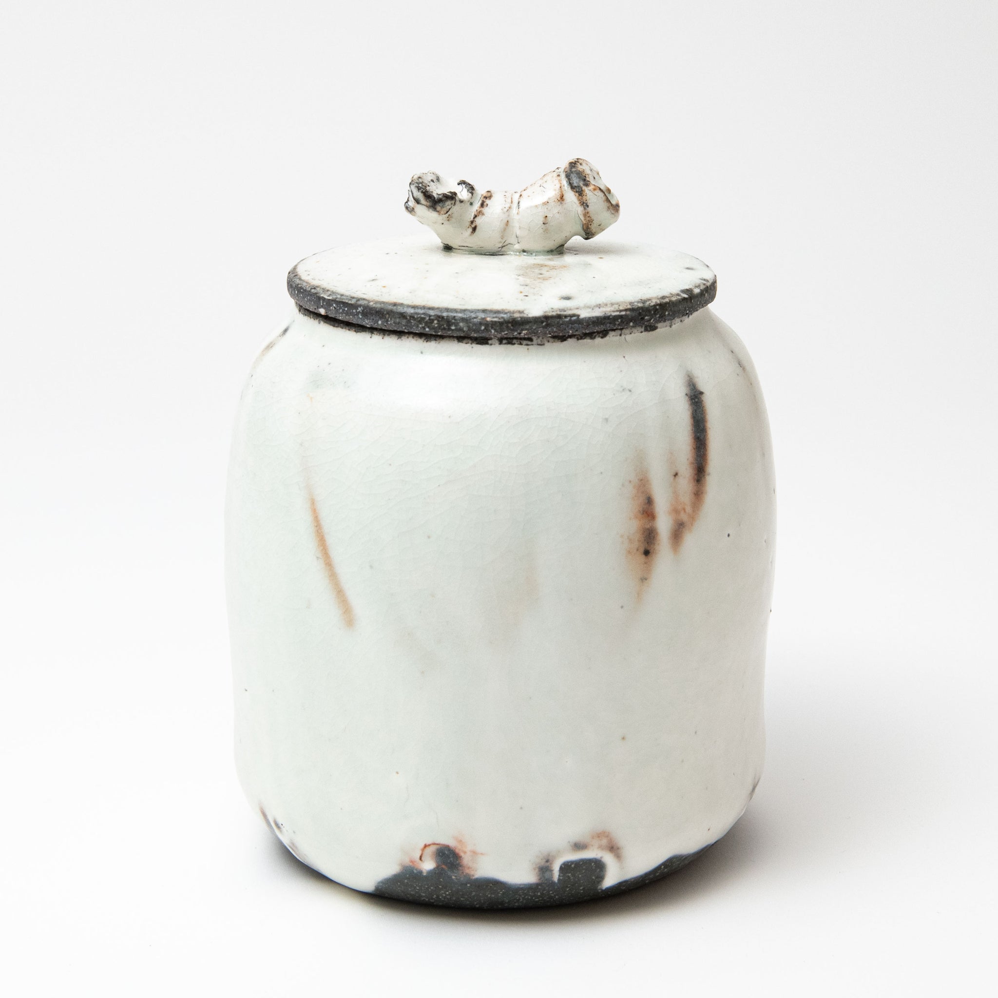 Lee decorates his pots using the traditional Korean method of Buncheong. White slip is applied to a dark stoneware body. Whilst it is still wet Lee uses his hands to spread it over the pot.