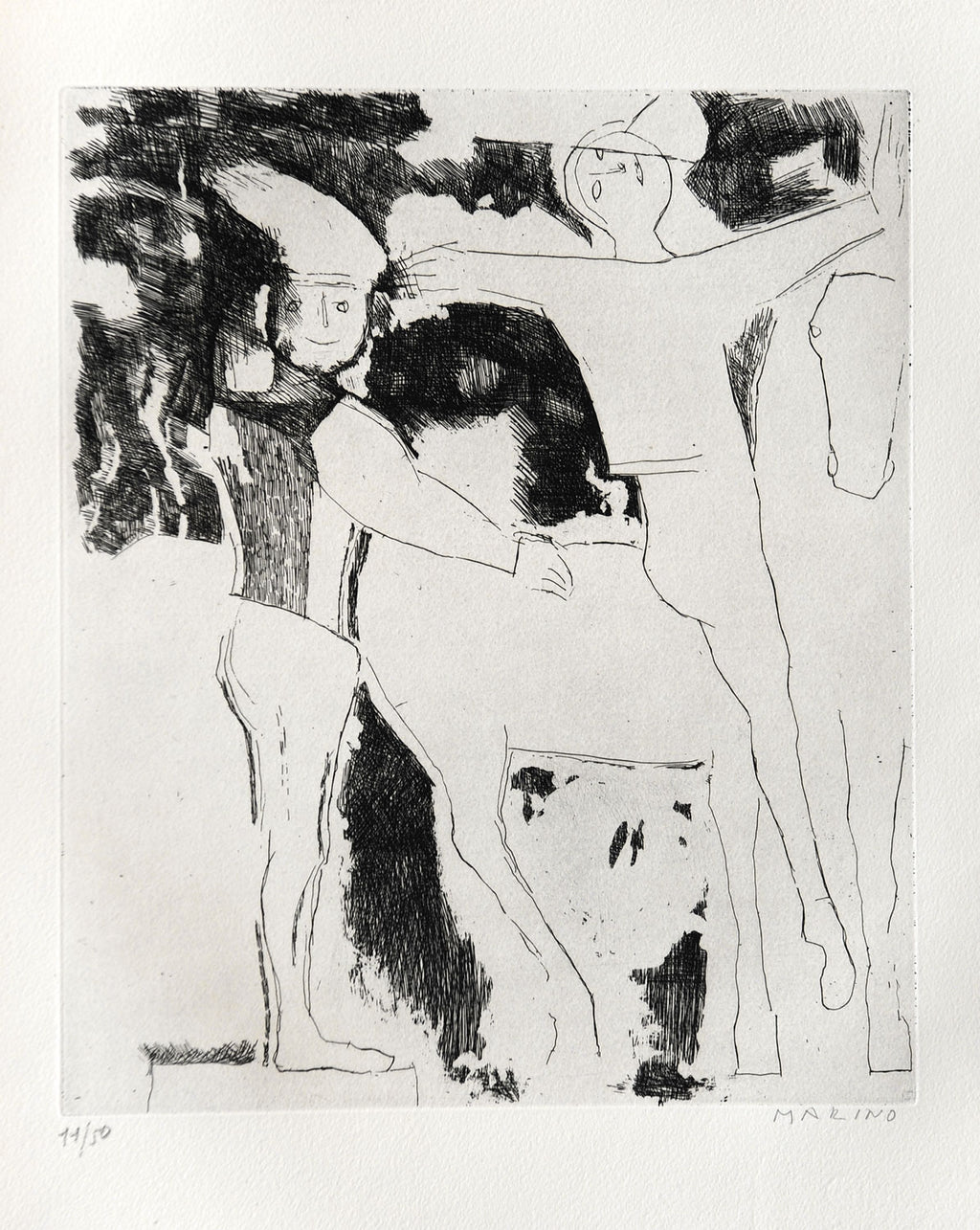 The horse and rider and simple nudes take their inspiration from Etruscan art and classical mythology and are enduring themes throughout Marini's sculpture and printmaking.