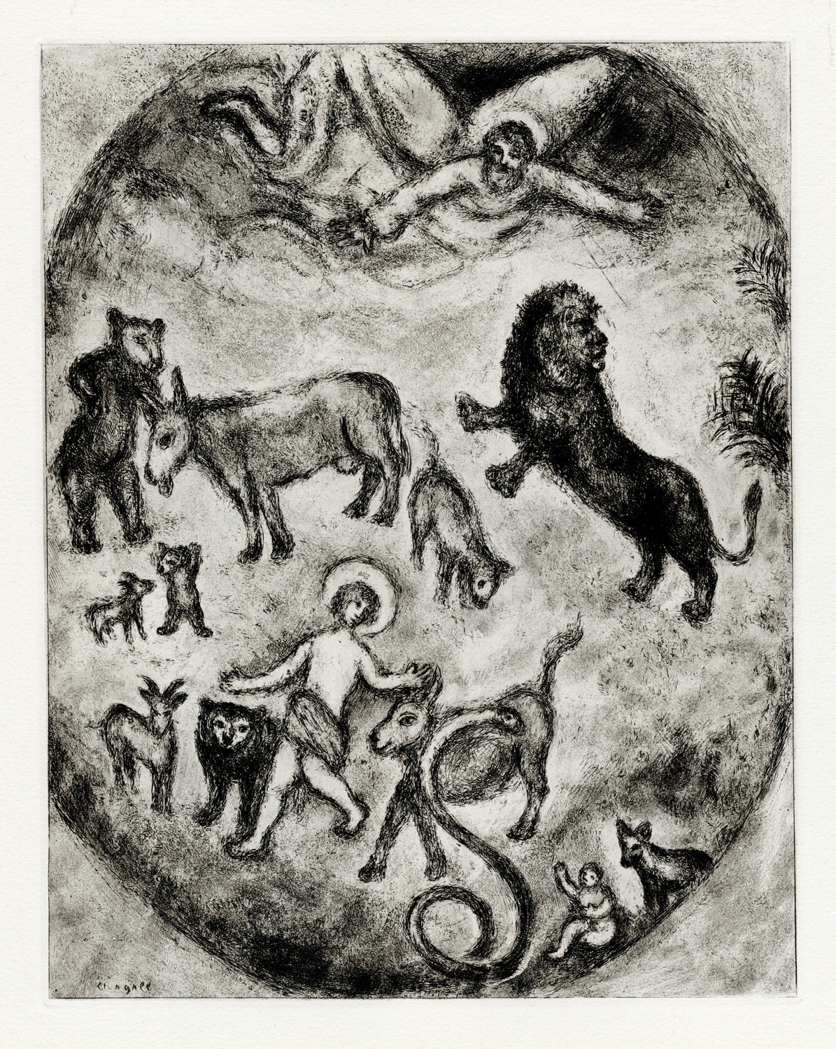 This etching is from Chagall’s sublime Bible series. Almost 10 years in the making, and comprising over 100 etchings, it was the third of Chagall’s etching suites to be commissioned by the publisher Ambroise Vollard. Chagall’s Jewish identity had always informed his work; in this major suite, begun in 1930, it was to take centre stage.