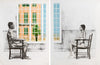 The artist is depicted with his wife Lynda on the opposite side of a colourful window setting.